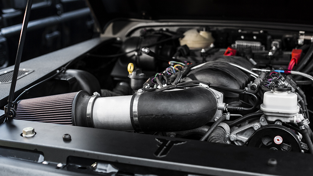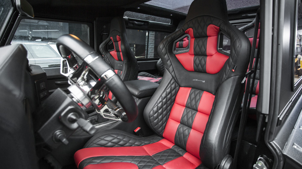 But there’s even more hardware to enjoy. The new Volcanic Black 20 x 9.0 Mondial wheels with 275x55x20 tires from the Chelsea Truck Company are driven by 6.2-liters of naturally-aspirated V-8 fury. The new engine produces an estimated 450 bhp and is connected to a six-speed automatic gearbox giving the SUV some bite to back up its bark. The suspension and brakes were also upgraded to accommodate for the new drivetrain and make the Defender even more capable in off-road situations.