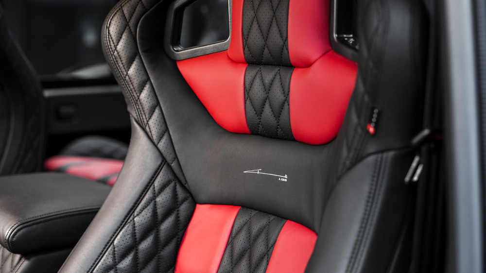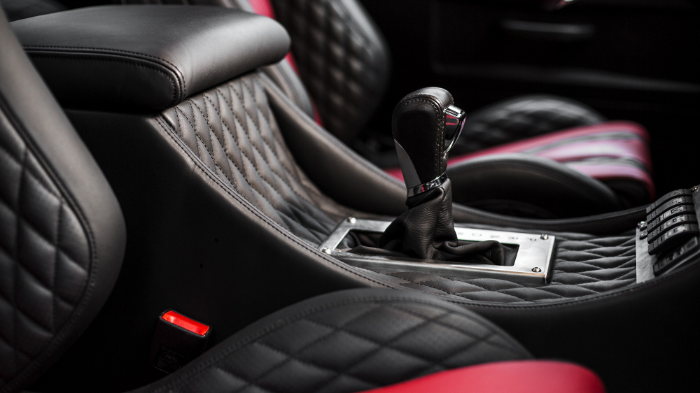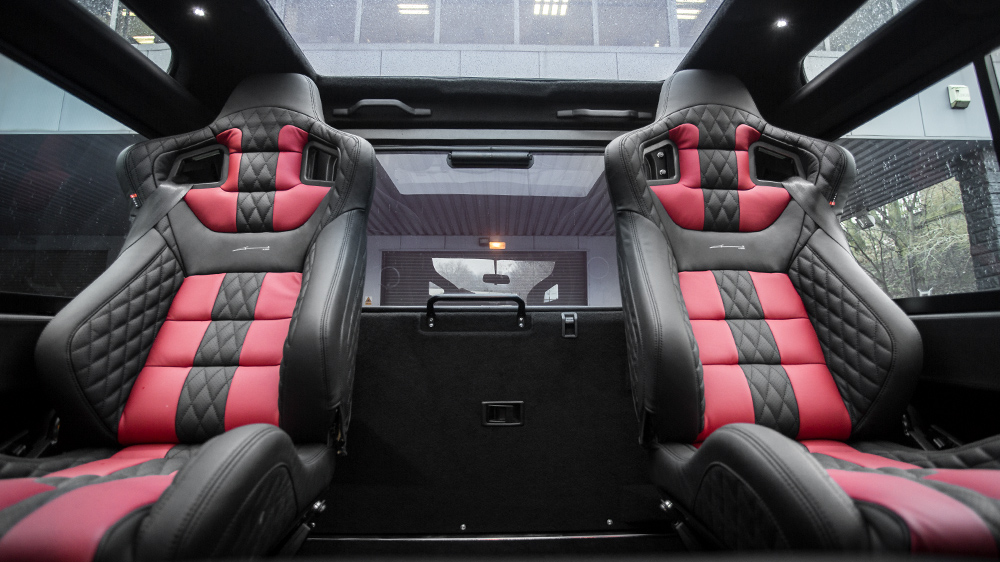 Inside, there’s a lot to enjoy. The Land Rover Defender XS Station Wagon 6.2 Flying Huntsman 105 Long Nose Wide Body has a mix of red and black leather with special stitching on the front and rear GTB seats, rear passenger knee protectors, and passenger dashboard top and grab handles. There’s an Alcantara headliner and instrument binnacle in Nappa leather while the rear side panels, A-pillars, and cubby box in soft leather. The center console has even been customized and wears Piano Black leather.