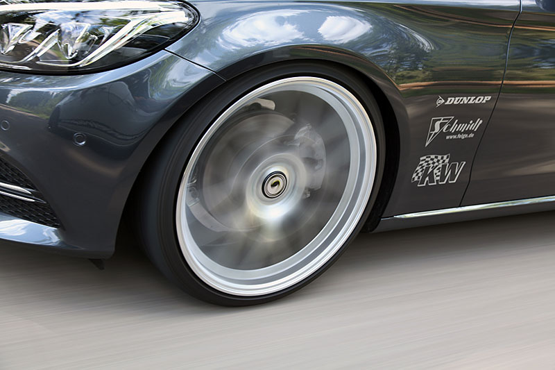 The new wheel and tire fitment was paired up with a new KW coilover suspension that reduces ride height and optimizes handling. The Mercedes-Benz C-Class was equipped with a set of KW Variant 3 coilovers from their Inox Line. These coilovers have the ability to reduce the ride height by 35 to 70 mm for a better center of gravity. Drivers can also adjust the damping in rebound and compression, independently of each other. Schmidt Revolution can also install the KW Variant 1 and 2 coilovers instead, and a KW DCC ECU coilover setup with electronic damping adjustment is currently in development for the new W205.