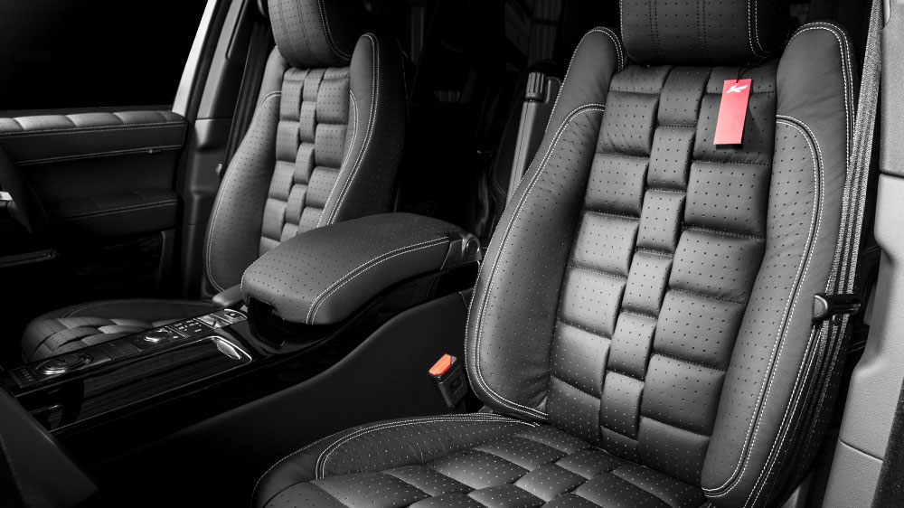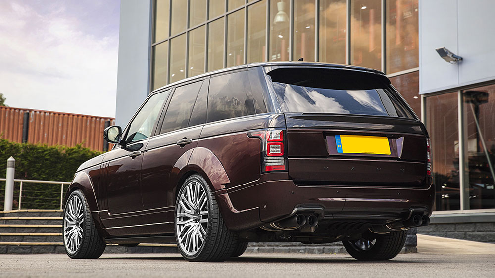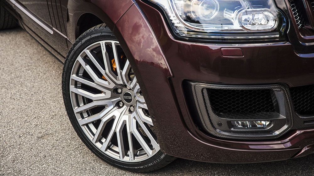 Aside from the custom color combo, the new Project Kahn Range Rover Vogue SE Pace Car has a more commanding and prominent presence thanks to some new carbon composite and exposed carbon fiber body work. Up front, a new bumper incorporates the factory fog lights and new 3-D mesh inserts in the air intakes. A new grille with floating insert creates a more distinct look. At the rear, a new precision-designed bumper is featured with an exposed carbon fiber lower trim around the quad cross-hair tailpipes. Above, a new extended trunklid spoiler sits, dressed in the smooth Rolls Royce Black Kirsch color.