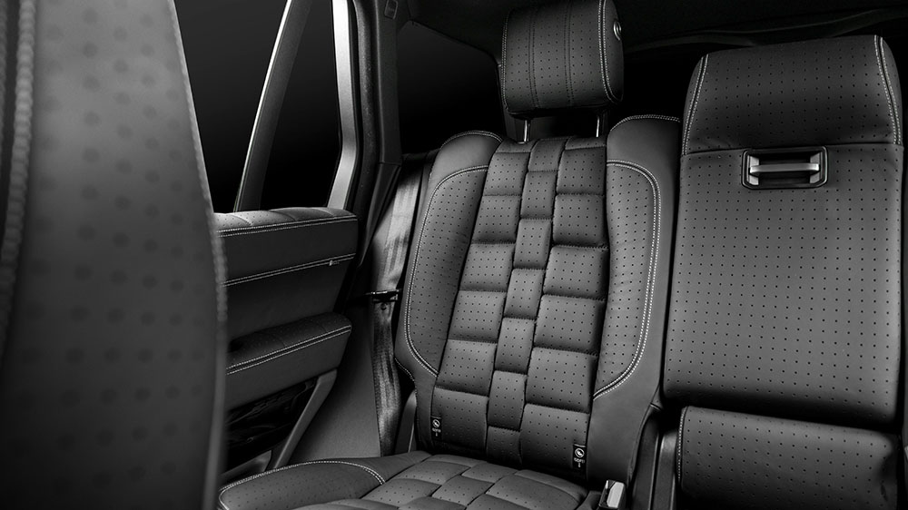 Past the privacy-tinted glass, there’s a wealth of custom-tailored luxury for drivers and passengers. The Project Kahn Range Rover Vogue SE Pace Car was outfitted with quilted and perforated black leather upholstery on the front and rear seats. Even the door tops and arm rests, center console, instrument binnacle, and center of the steering wheel were given matching upholstery. New stainless steel door entry sill plates and machined aluminum foot pedals add an even more luxurious SUV.