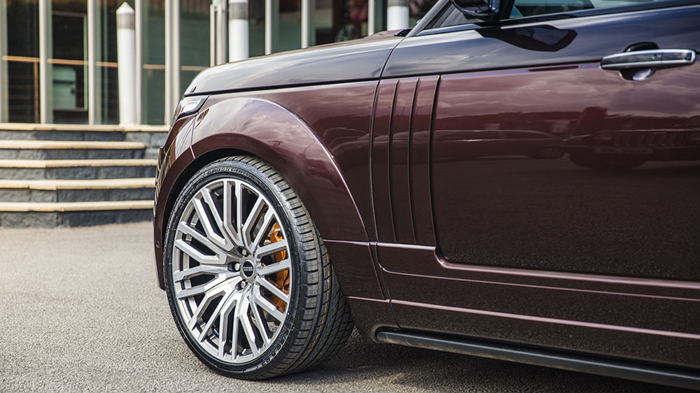 Part of what gives the new Project Kahn Range Rover Vogue SE Pace Car more presence is the new extended arches and wheels. Both the front and rear factory wheel arches were replaced with wider units boasting integrated air dams. To fill in the larger arches, new RS650 forged wheels were installed in a mighty 23 x 10.0 fitment at the front and rear. These Diamond Cut on Shadow Chrome finished wheels also wear 305/30/23 tires.
