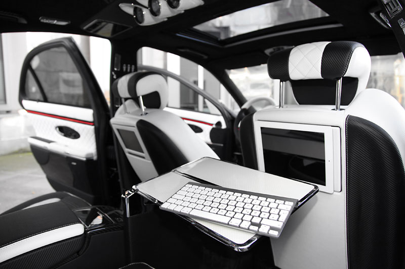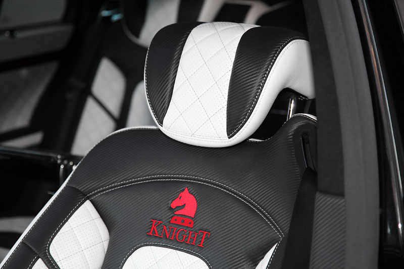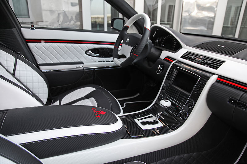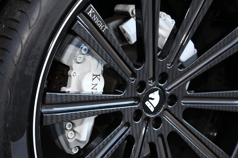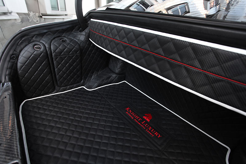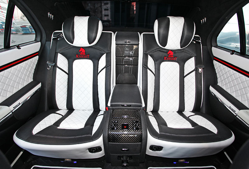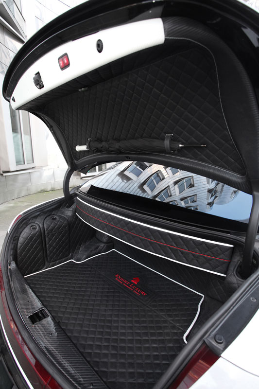 Inside is where the real magic happens. Knight Luxury equipped the Sir Maybach 57 S with plush diamond-stitched leather trimming on the seats with embroidered Knight logos, foot area, and door panels, while the Knight logo also adorns the center console and floor mats. An ergonomic sports steering wheel with red Kederrand protrudes from the black and white carbon leather dashboard. The headliner has a special touch of leather with carbon diamond stitching Alcantara. Even the luggage can ride in comfort with the carbon diamond stitching and diamond logo. Overall, 28 parts were replaced by white carbon trim and 39 parts were replaced with black carbon fiber trim pieces.