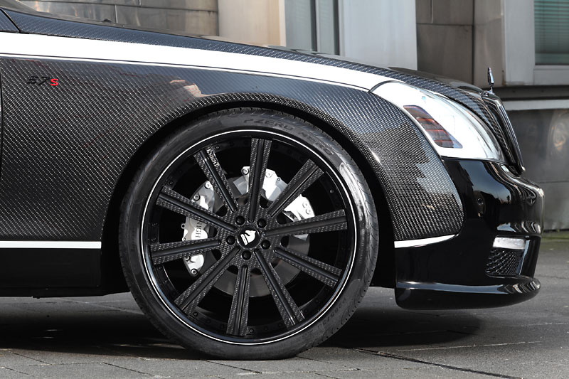 Making contact with the ground are three-piece 24-inch wheels in a massive 9.5 x 24 front and 10.0 x 24 rear setup. Each wheel on the Sir Maybach 57 S features a carbon finished painted rim star and black powder coated beds, while white pinstripes, black reflector stripes, and custom logos give some style to the new shoes. Pirelli 285/30 R24 tires are fitted to each wheel and white-painted brake calipers peer from behind the spokes.