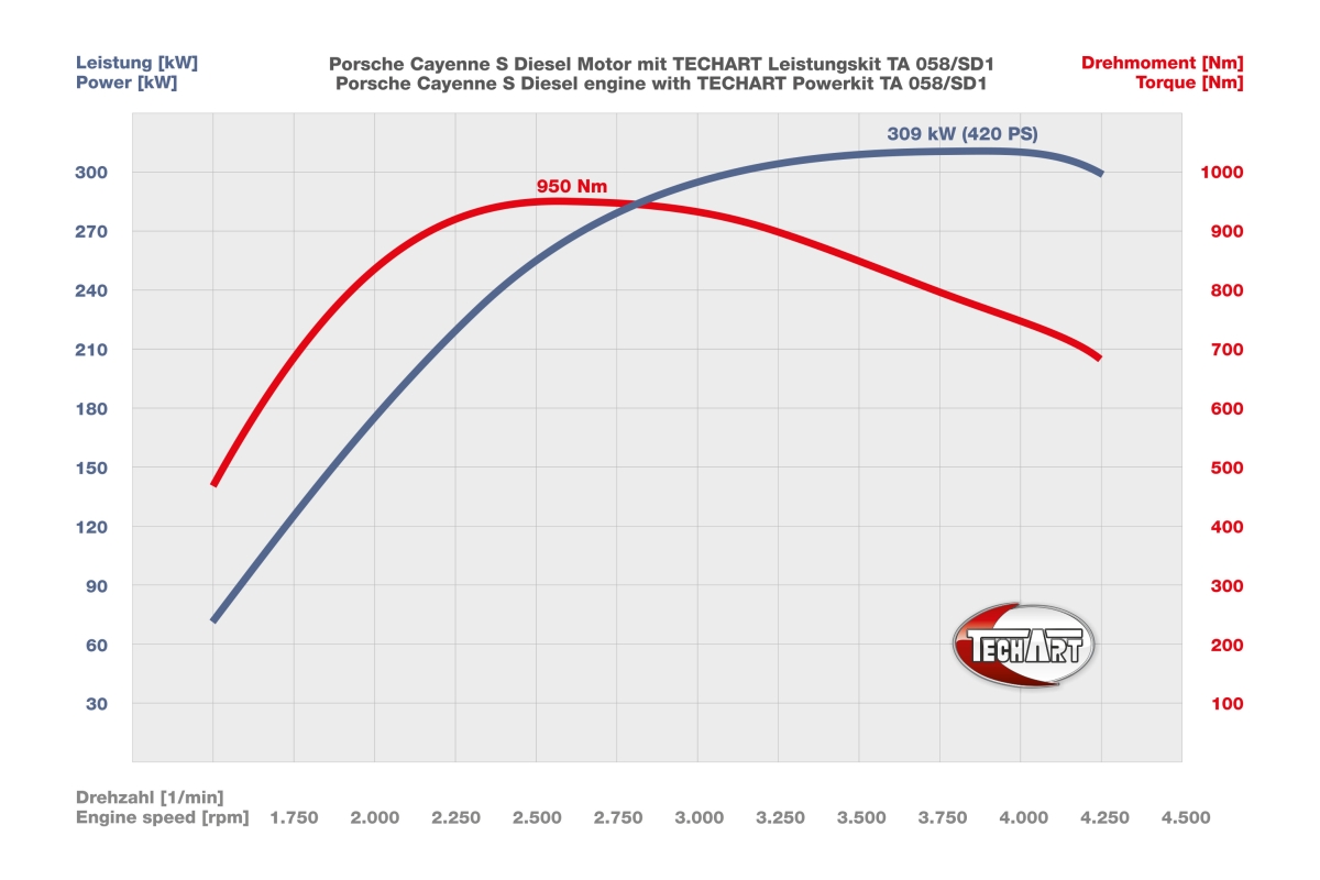 The 4.2-liter turbodiesel V-8 engine found in the Porsche Cayenne comes with plenty of brute force from the factory. A total of 382 bhp at 3,750 RPM and 630 lb-ft. of torque from 2,000 to 2,750 RPM is more than enough to get things done, but the new TechArt TA 058/SD2 Power Kit based on the TechTronic engine management system makes things a lot more fun and exciting.