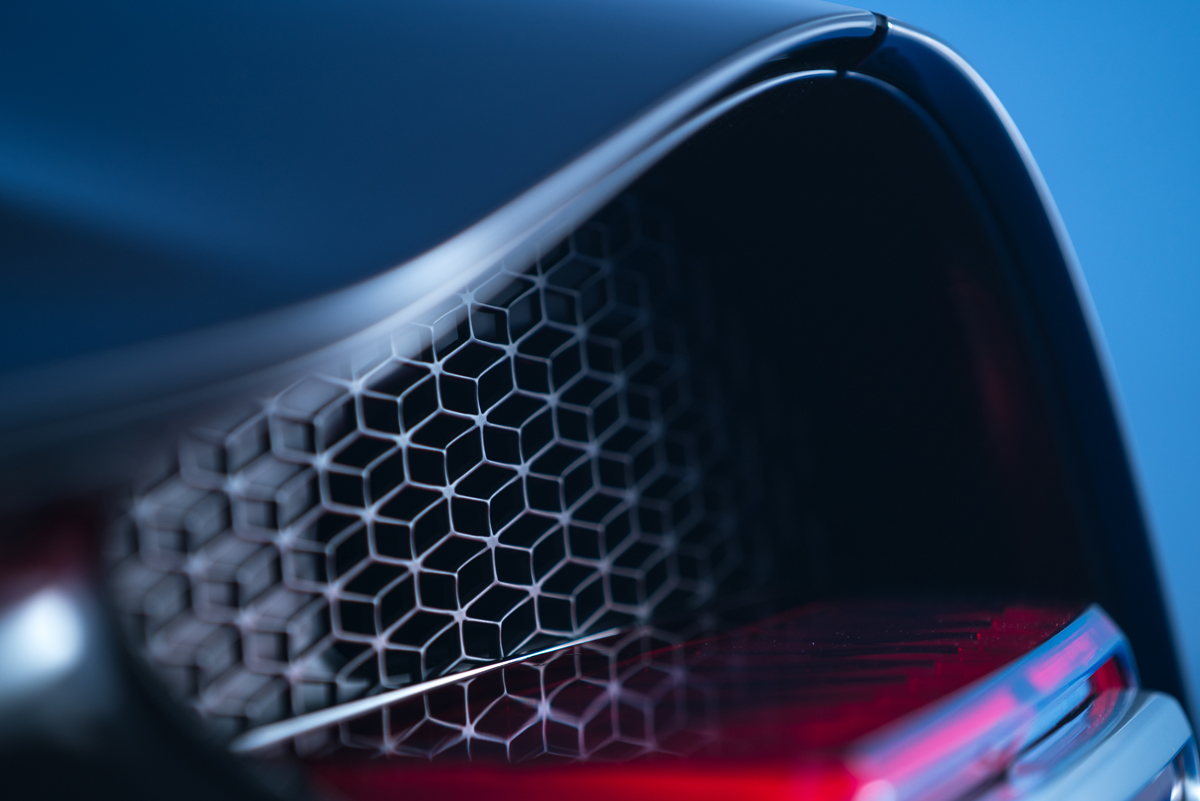 The two-tone color scheme runs throughout the exterior and incorporates a high-gloss, hand-polished aluminum alloy side line. The line itself integrates new air intakes for the engine along each side as it sweeps around from the window to the lower portion of the door. A central fin runs from the roof to the rear fascia, creating a dynamic, powerful look.