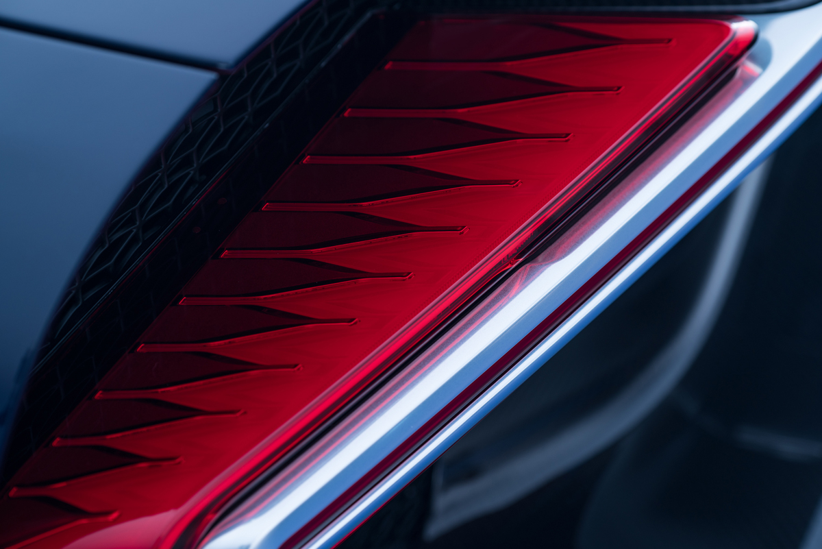 The Bugatti Chiron and its newly-designed rear fascia features an active aero wing and special diffuser with fins that combine with the flat underbody. The rear aerodynamics create a negative pressure zone that sucks hot air from the engine for better cooling. An innovative 82 Super RED LED light strip measures 1.6 meters and marks the first time such an element has been used in a production vehicle.
