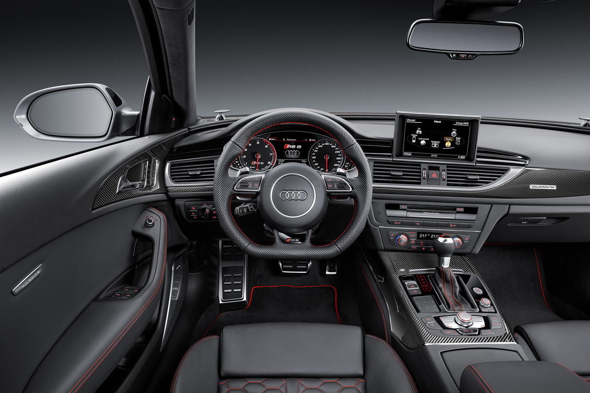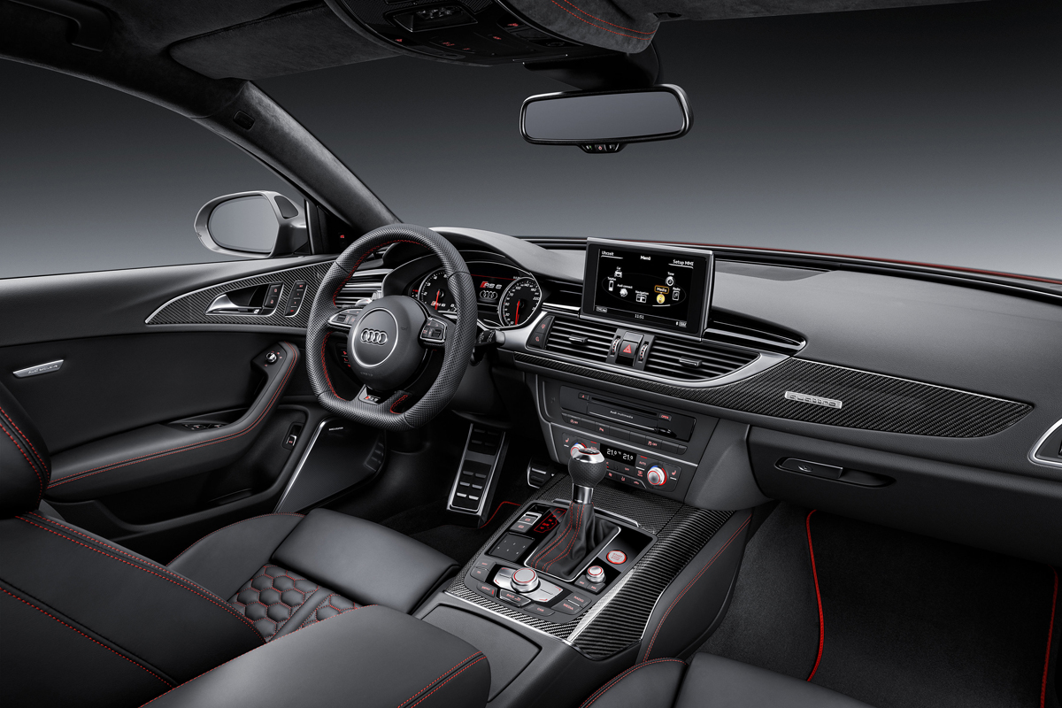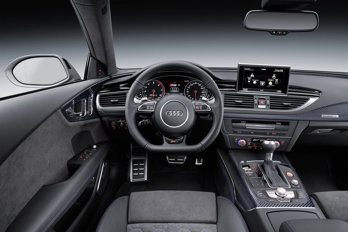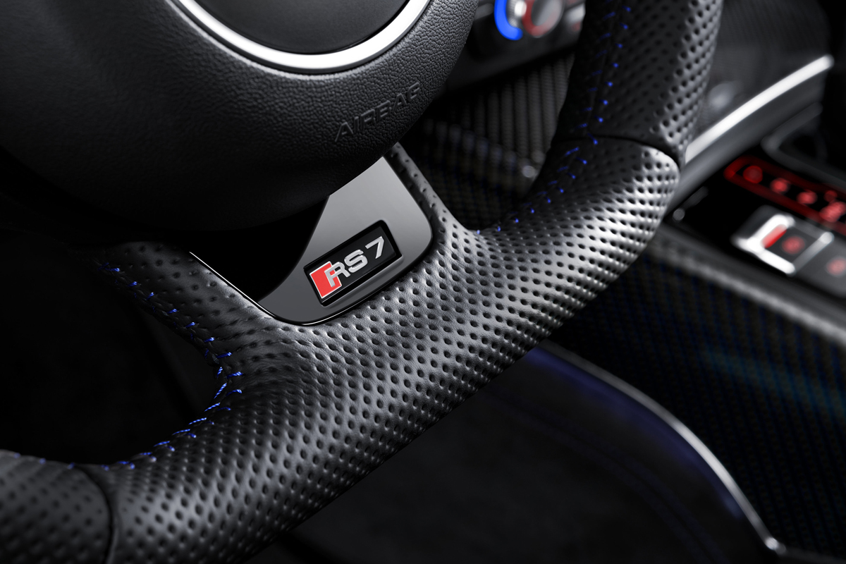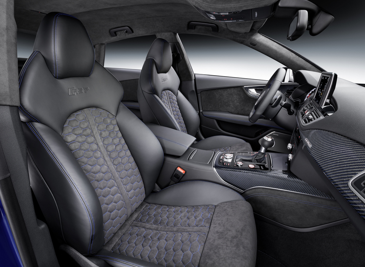 Inside, leather and alcantara is the name of the game. The Audi RS6 Avant Performance and RS7 Performance feature standard RS sport seats with larger side bolters. The optional RS performance design package tacks on black and blue alcantara and leather upholstery with a honeycomb pattern that matches the floor mats, arm rests, and controls. New black instrument faces with white dials and red needles add a more performance-oriented touch for drivers.