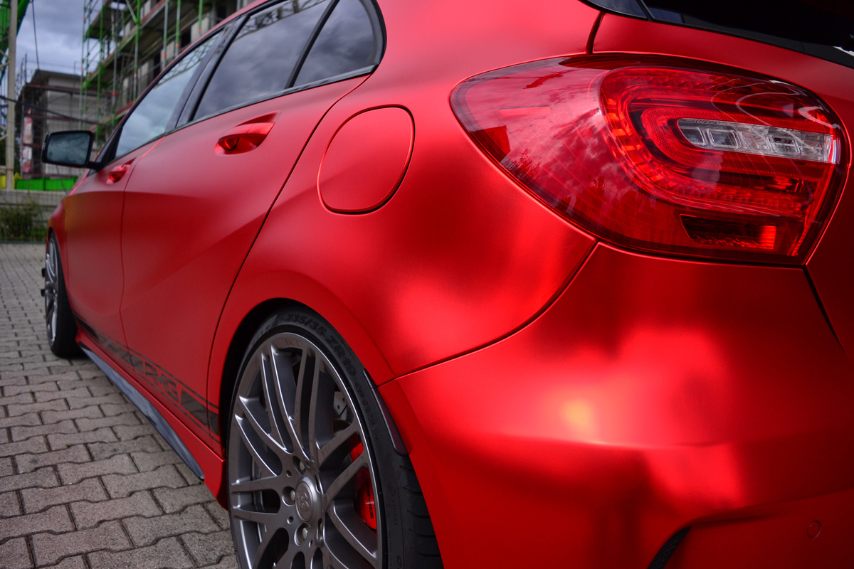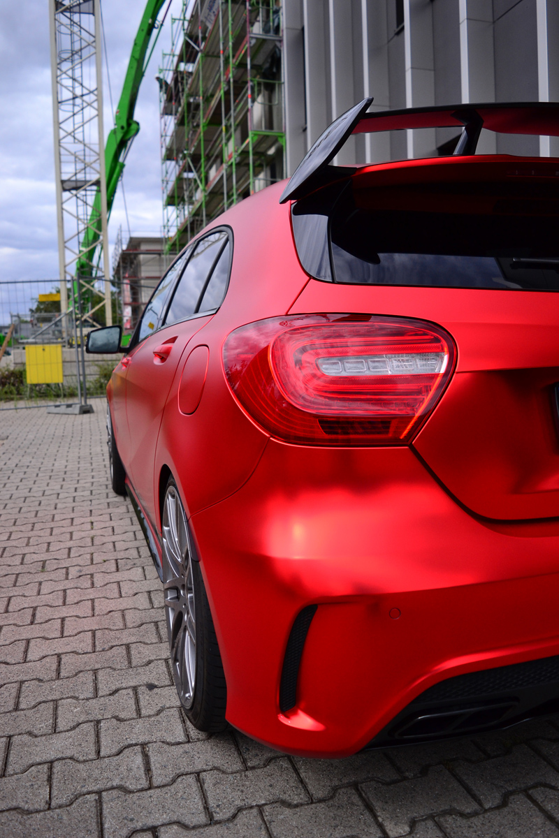 Wrapping is the latest and greatest thing in the automotive world today as it allows owners to completely redesign their vehicle without damaging the paint or force to fork up the money for re-painting. Folien Experte has been performing these transformations since 2007 in Germany and their latest work includes one vibrant red Mercedes-Benz A45 AMG.