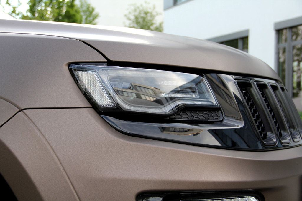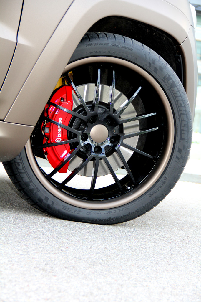 The next step was the wheel and tire setup for the Jeep. GeigerCars added on a net set of alloy wheels to their featured supercharged model in a large 10.0 x 22 setup with 305.35 R22 tires. To complete the project, the featured Jeep Grand Cherokee SRT was given a custom brown wrap with black graphics and logos.