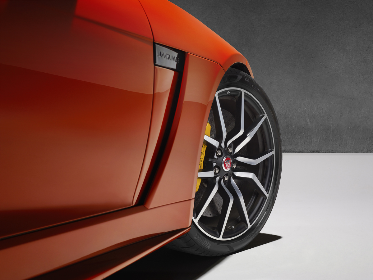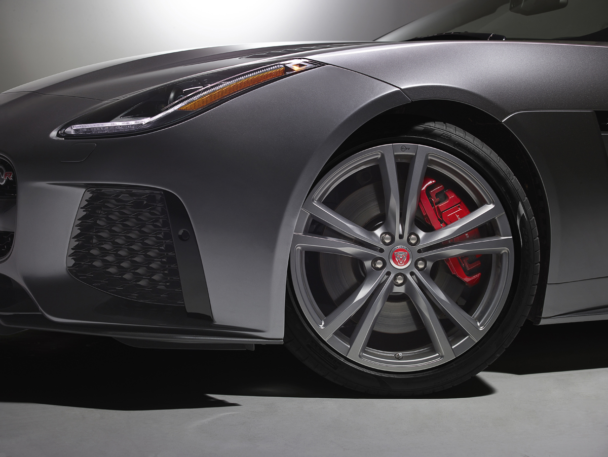 New Coriolis wheels in Satin Technical Grey or Gloss Black come standard in a 9.0J x 20 front and 11.0J x 20 rear setup with wider 265/35 ZR20 and 305/30 ZR20 tires. The forged wheels reduce weight a total of 30 lbs. compared to the rest of the model lineup. Behind those wheels are the Jaguar Super Performance brakes with 380 mm front and 376 mm front and rear discs. As an option, the Jaguar F-Type SVR can be equipped with lighter, fade-free Carbon Ceramic Matrix (CCM) brakes with 398- and 380 mm discs grabbed by six- and four-piston monobloc calipers.
