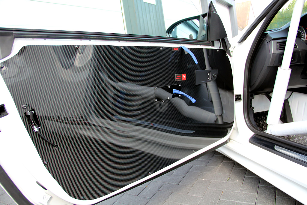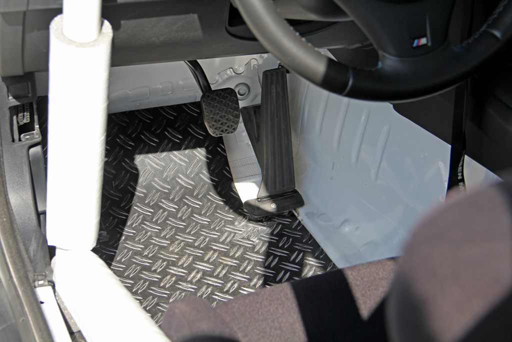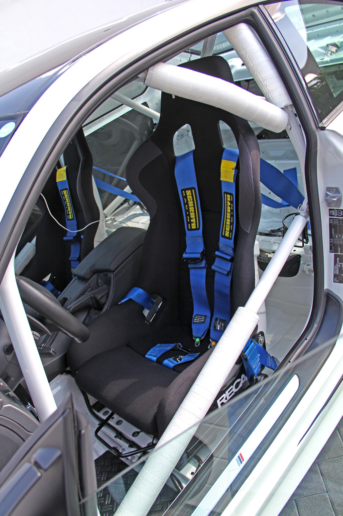 The first part of the conversion for the BMW M3 is a full tear down where all of the seating, sound insulation, trim pieces, and unnecessary parts are removed for the sake of saving weight. The interior is then given a full body-colored paint, which was white in this case. A full roll cage in body color is also added for safety while new Recaro Profi SPG motorsport seats with four-point Schroth harnesses are added to hold driver and passenger in place. The final touch is a new alloy checker plate on the floor to prevent damage to the paint.