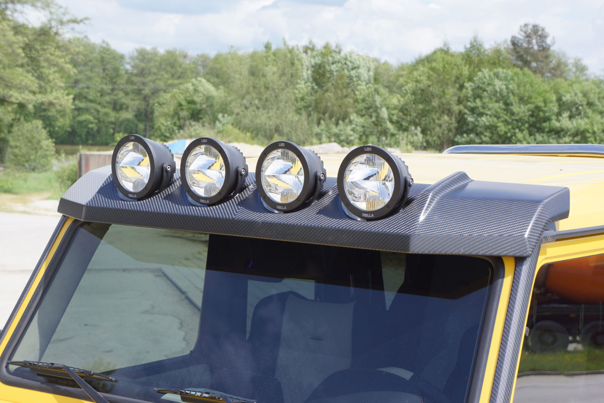 The big, brawny Mercedes-Benz G63 AMG 6×6 wears a new coat of lightweight pre-preg autoclave carbon fiber that shows that the monster SUV means business. A full front fascia and lower bumper are made from the lightweight material and feature integrated LED daytime running lights. Carbon fiber surrounds the new headlights that are a part of the new Mansory lighting system. The system features two new headlights, daytime running lights, additional indicators, and four new headlights on the roof perched atop a carbon fiber base.