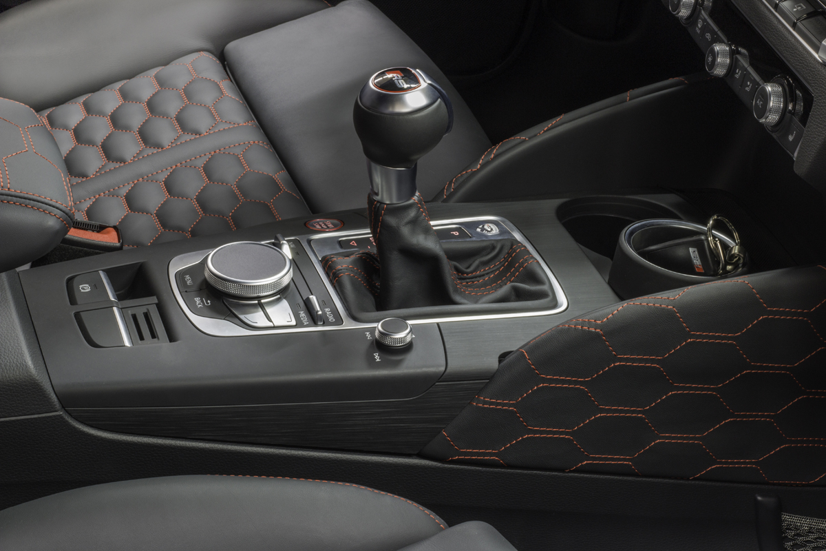 The interior of the MTM RS3 R is geared towards performance-oriented driving with a custom-tailored touch. The two front RS6-style front seats wear a special honey-comb stamping and MTM logos that is also applied to the rear set of seats as well. The center console, door panels, and arm rest also bear the special honeycomb stamping.
