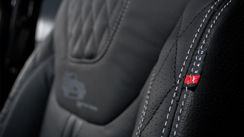 Right off the bat, the Jeep Wrangler CJ300 stands out with its vibrant Firecracker Red paint that’s contrasted by Piano Black door handles, mirrors, and roof, while Satin Black is worn by the fuel filler cap. The red-and-black theme is also featured up front where two shadow chrome headlights sit on either side of the four-slot Chelsea Tuck Company grille with industrial mesh. A new Chelsea Truck Company spare wheel cover, Kahn enamel tailgate logo, and fender shields showcase its design roots.