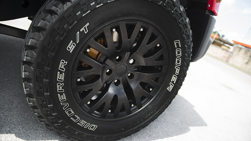 Below the body work of the Jeep Wrangler CJ300 sits a mighty set of Jeep 1941 wheels in Satin Black measuring 7.5 x 17 at both axles with meaty 245/75/17 tires. Liquid Red brake calipers sit behind the black wheels to match the Firecracker Red body paint and contrast the dark-finished wheels. New mud flaps complete the fitment and allude to the all-terrain capability of the SUV. The final touch is an optional quad cross-hair exhaust system sitting beneath the rear bumper.