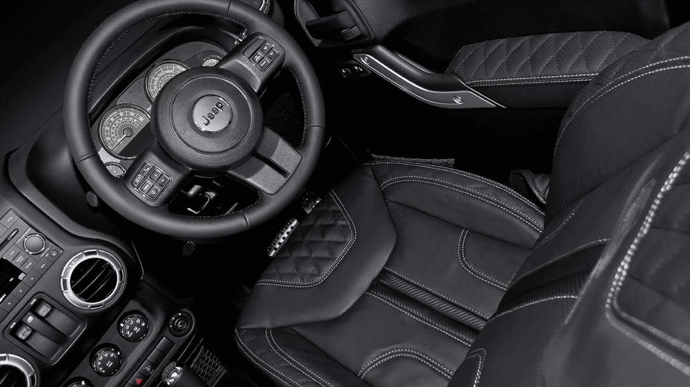 Past the privacy-tinted glass sits a more luxurious interior that still retains its purposeful roots. The front and rear seats, center console, and arm rests were all furnished with a soft perforated black leather with silver contrast stitching for a more comfortable ride. Stainless steel door entry sill plates, toughened rubber floor mats, and machined aluminum vented foot pedals keep with the off-road theme of the Jeep Wrangler CJ300.