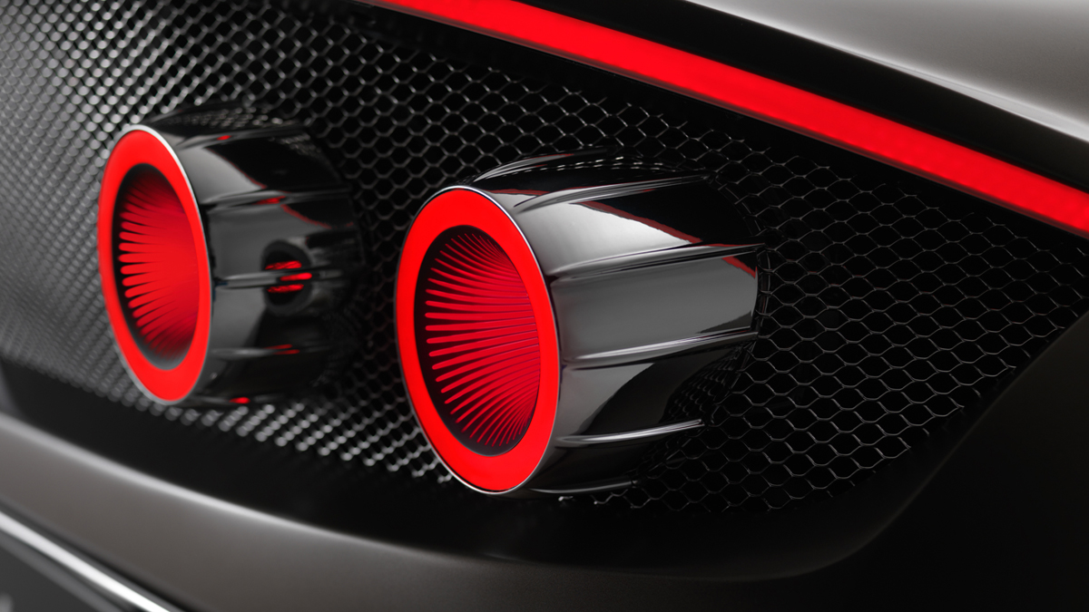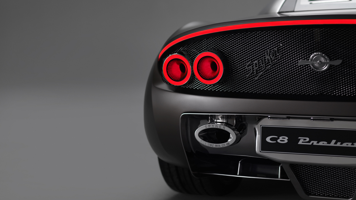 The same winglet design is used on the trailing edge of the side skirts on the Spyker C8 Preliator. Various NACA and traditional ducts are worn throughout the body from the hood to the fenders and roof, created a seamless, slipstream shape. At the rear, the LED CNC-machined stainless steel rear LED lights mimic the look of jet afterburners while machined and engraved exhaust tips sit below.