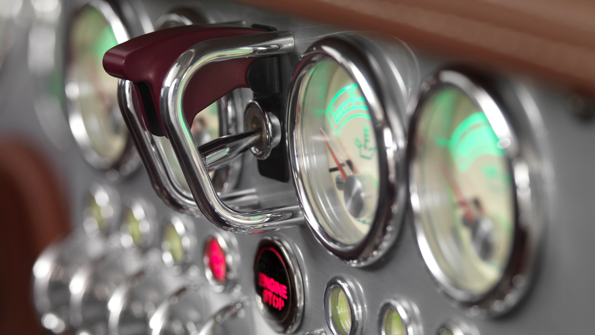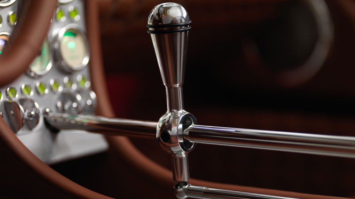 The dashboard of the Spyker C8 Preliator features turbine-style vents and a clean brushed aluminum trim. Vibrant green backlighting is used on each gauge while many controls are laid out with switches like an aircraft cabin. The classic exposed gear change mechanism is prominently featured as well. As an added high-end option, Machined Chronoswiss dials and switches can also be installed. A high-end sound system with integrated digital radio, Bluetooth, and Apple iPhone connectivity will come standard.