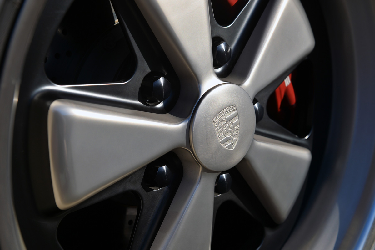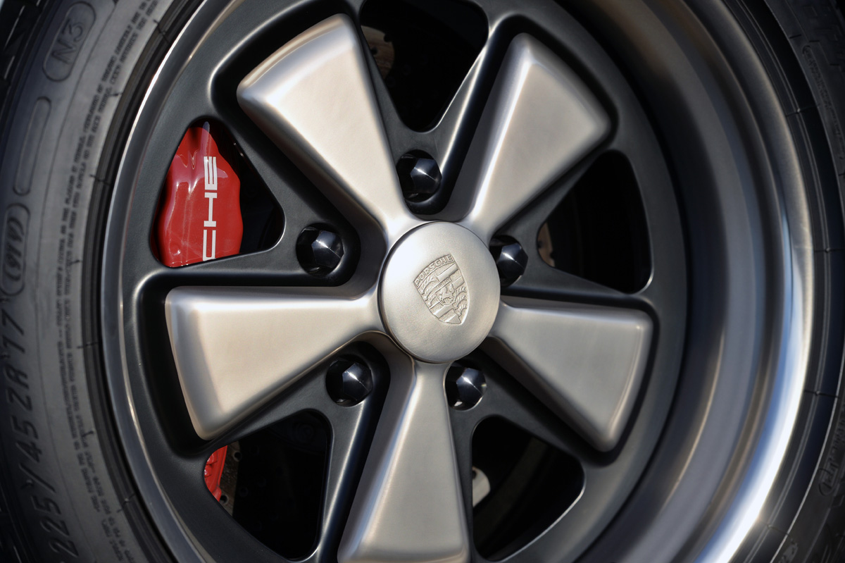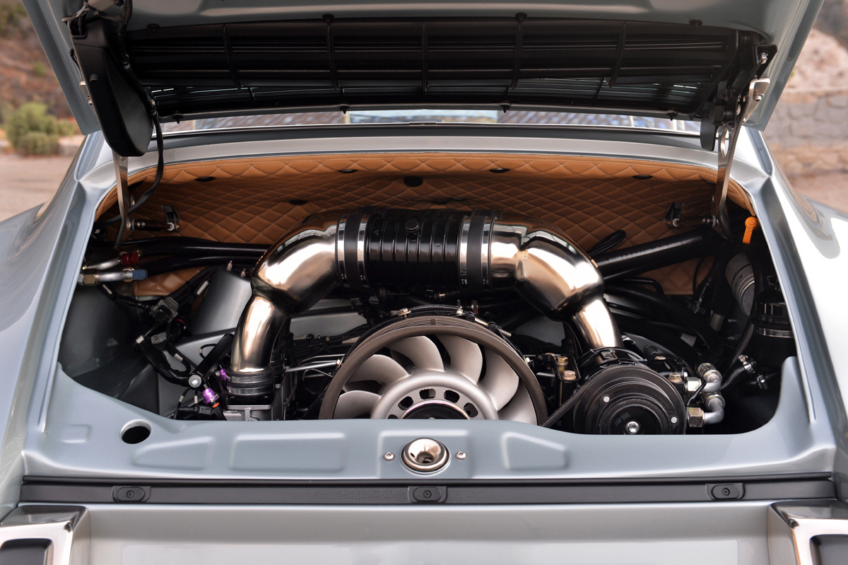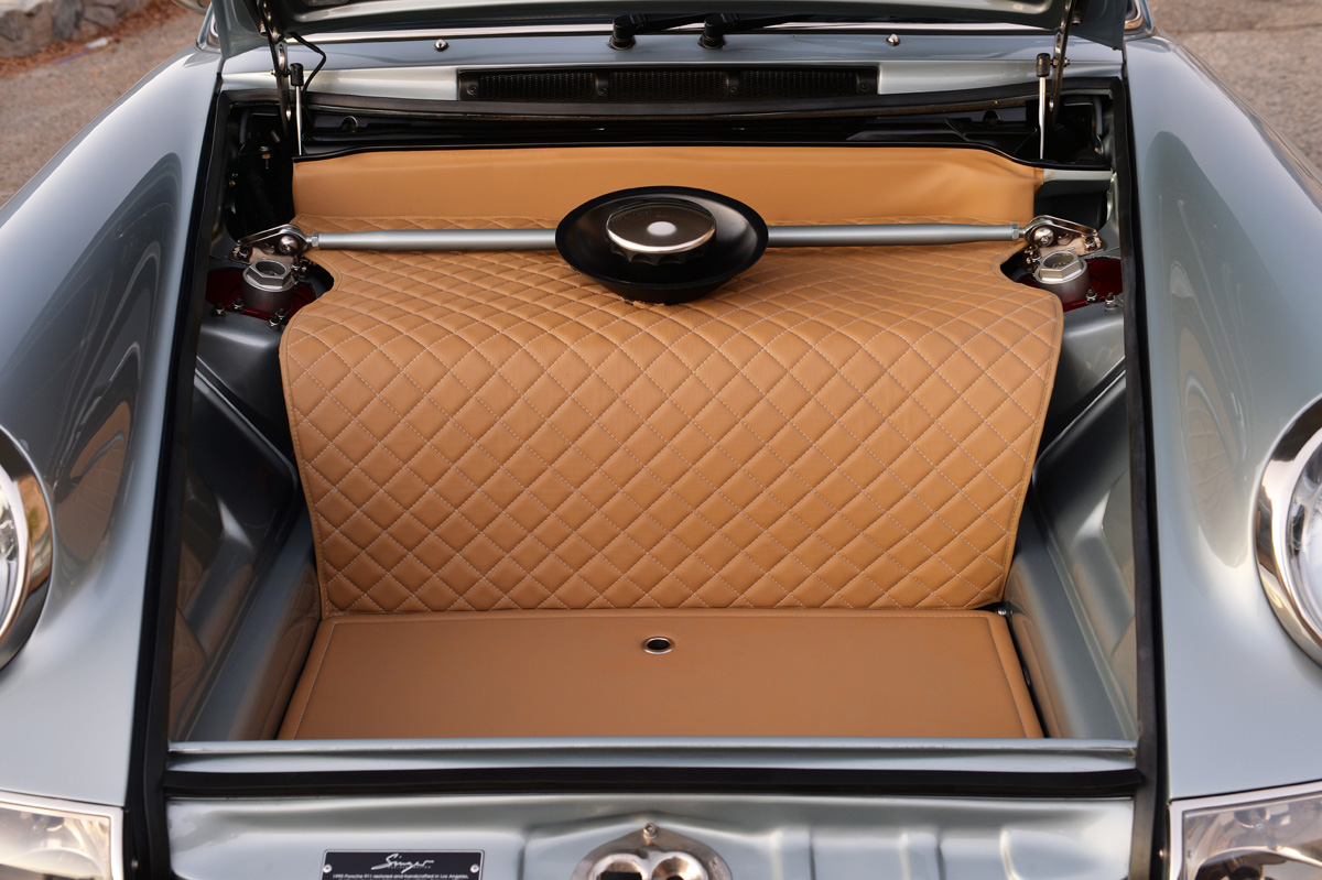Virtually every aspect and detail of Virginia was meticulously restored and refined by Singer Vehicle Design. A new 3.8-liter Cosworth-developed flat-six engine sits atop the rear wheels and produces 350 horsepower. Other performance upgrades include a full KW Suspension, bigger brakes, and a roll-hoop and harness-bar. The classic ‘Sport’-themed External Oil and Center-fill fuel caps are featured on the metallic Fish Silver exterior along with special raised gold ‘PORSCHE’ lettering along the rear, beneath the ‘Singer’ logo.