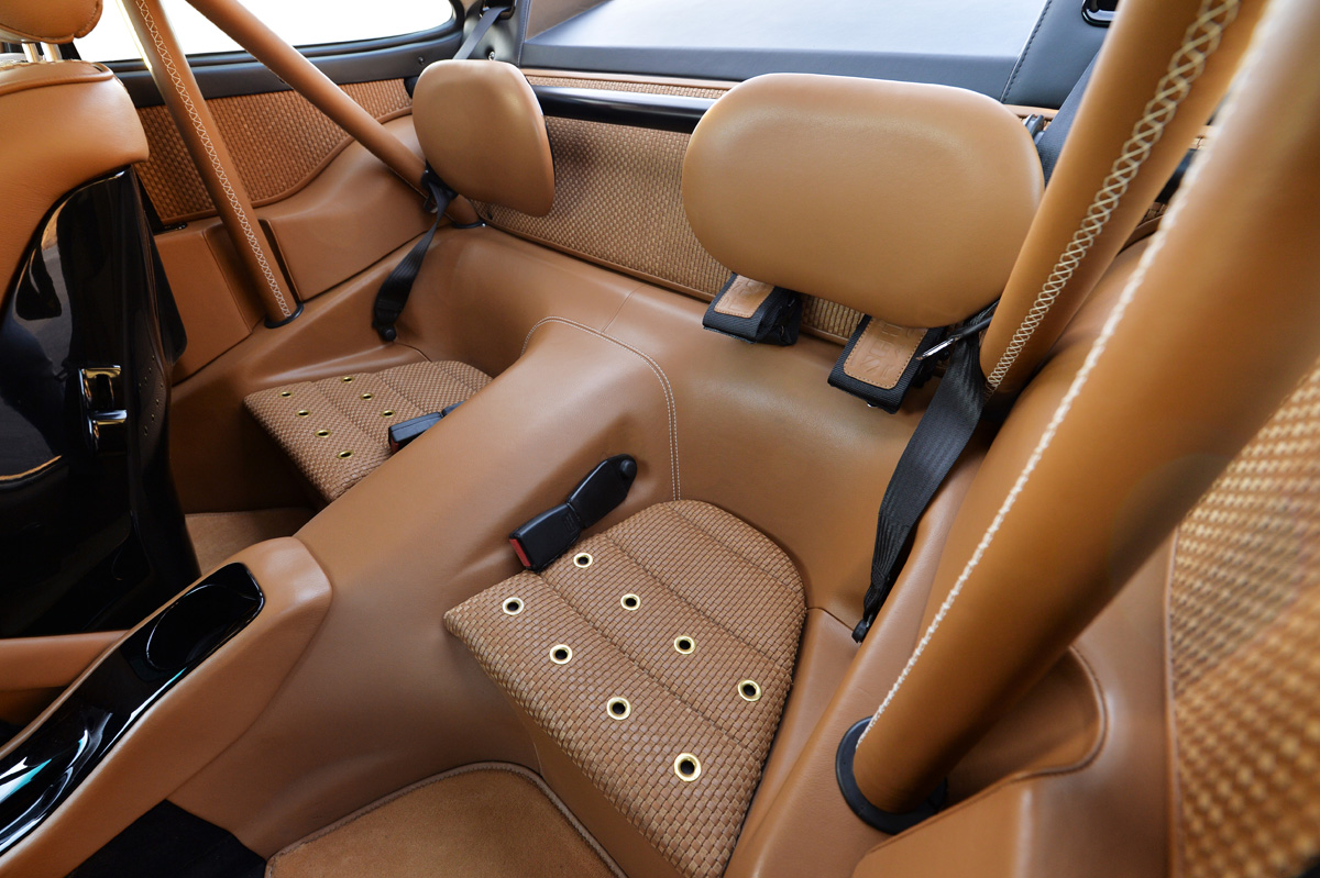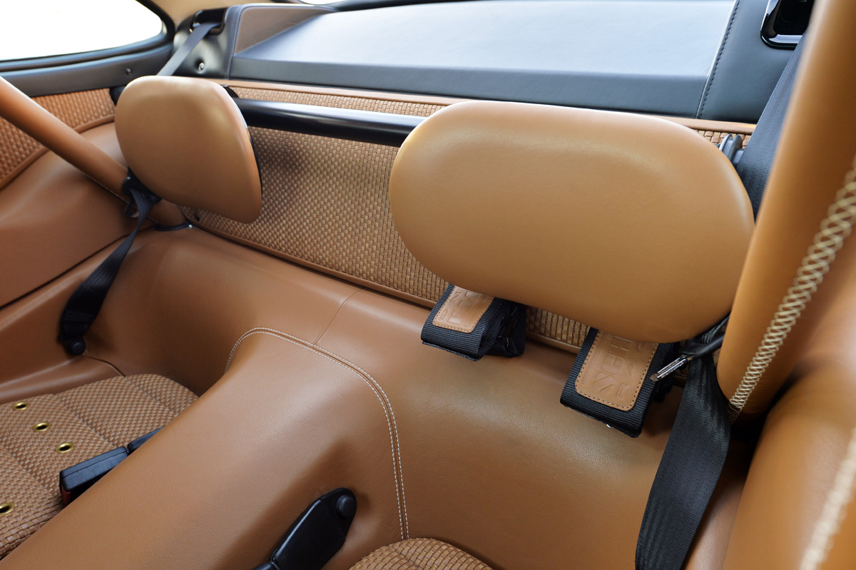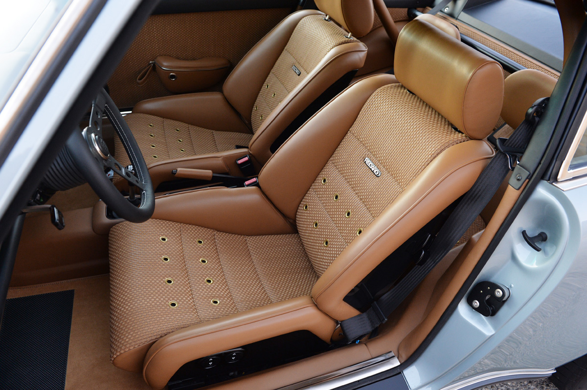 Inside, Virginia wears a clean, checkerboard-style Sand-Beige leather and suede interior. The same leather with diamond stitching is even used in the engine bay and front trunk to showcase the luxurious, custom-tailored elgegance. Clip-on rear backrests for the Recaro seats, new gauges, checkerboard leather dashboard trim, and contrasting black leather applications create a classy and traditional motoring feel. Not a single detail has been overlooked or neglected, making this the perfect atmosphere for driving.