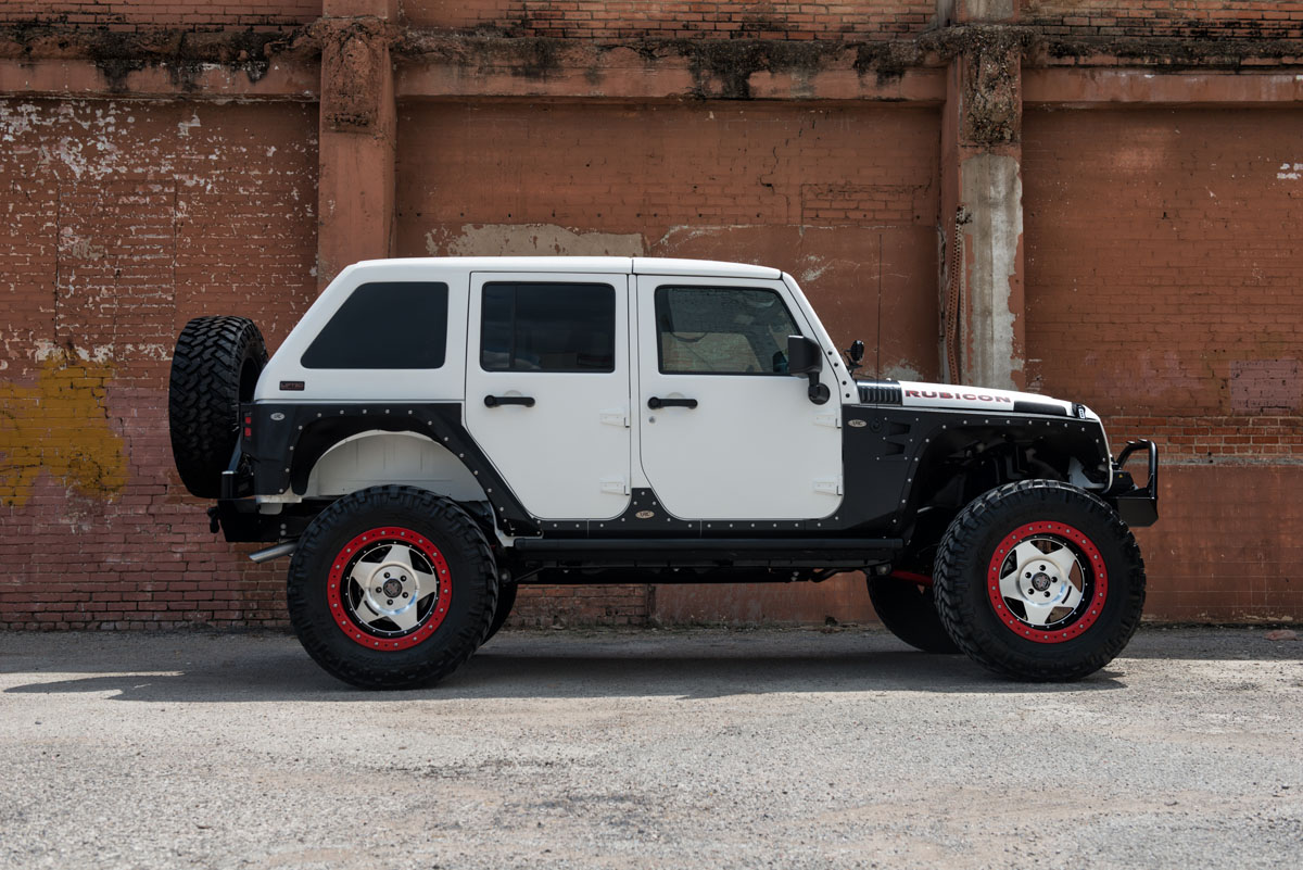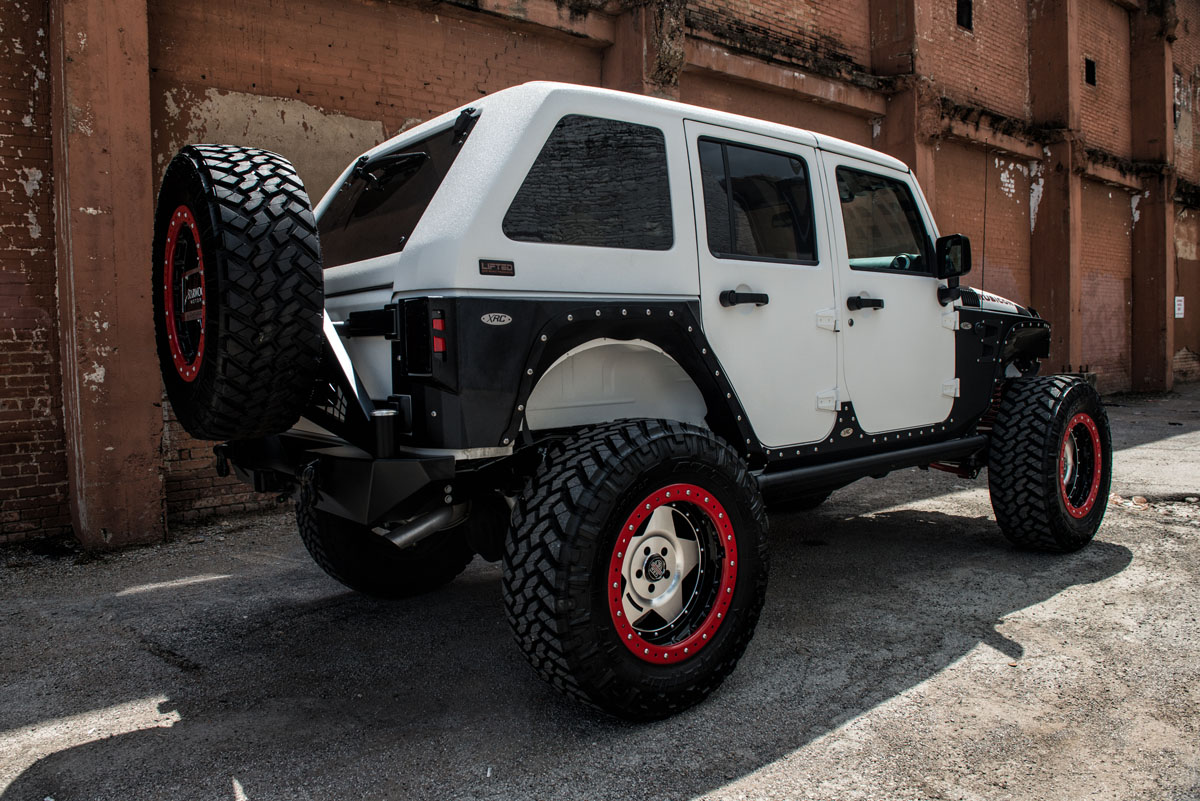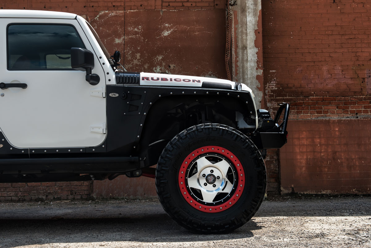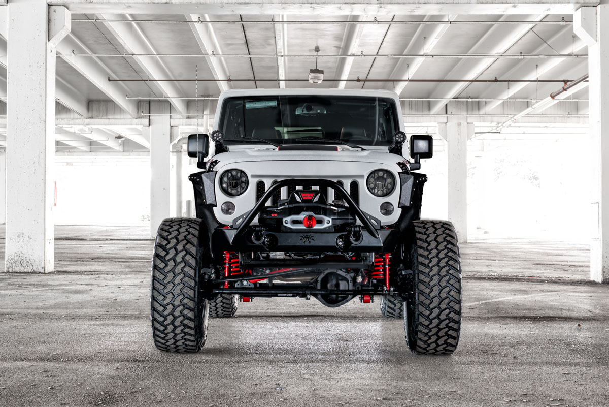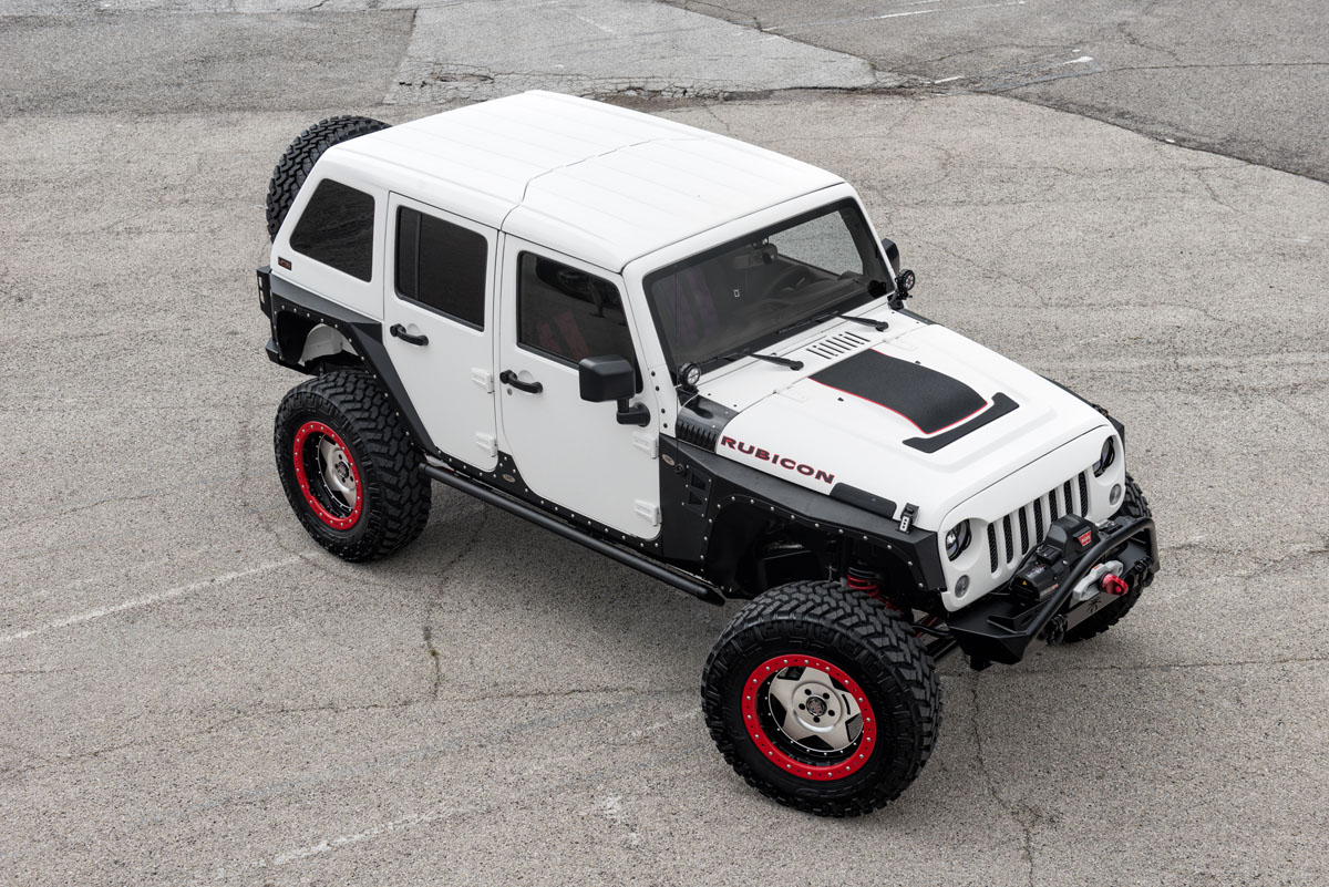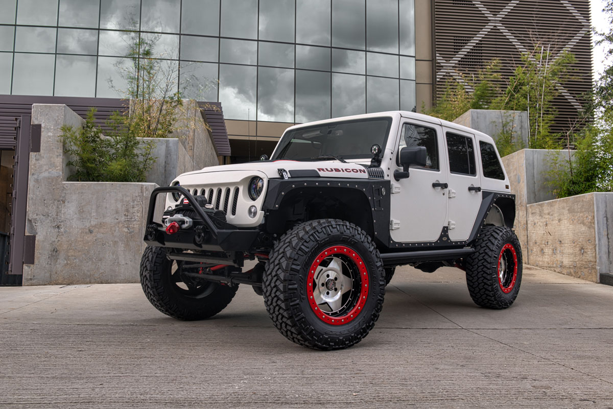 While this white and black Jeep Wrangler looks like a mean machine now, it started off as a stripped-apart, naked SUV before the Starwood Motors team worked their magic at their headquarters in Dallas, Texas. The entire body, Lifted Targa top, Rampage 3D grille, and the new AEV heat-reduction hood was sanded and given a coat of Bright White Kevlar. On the new hood, the Rubicon logos and the bulge in the center both feature a black paint with red outline. Other parts such as the bumpers, XRC Body Armor, and more wear a contrasting black finish to stand out with their added performance and style.