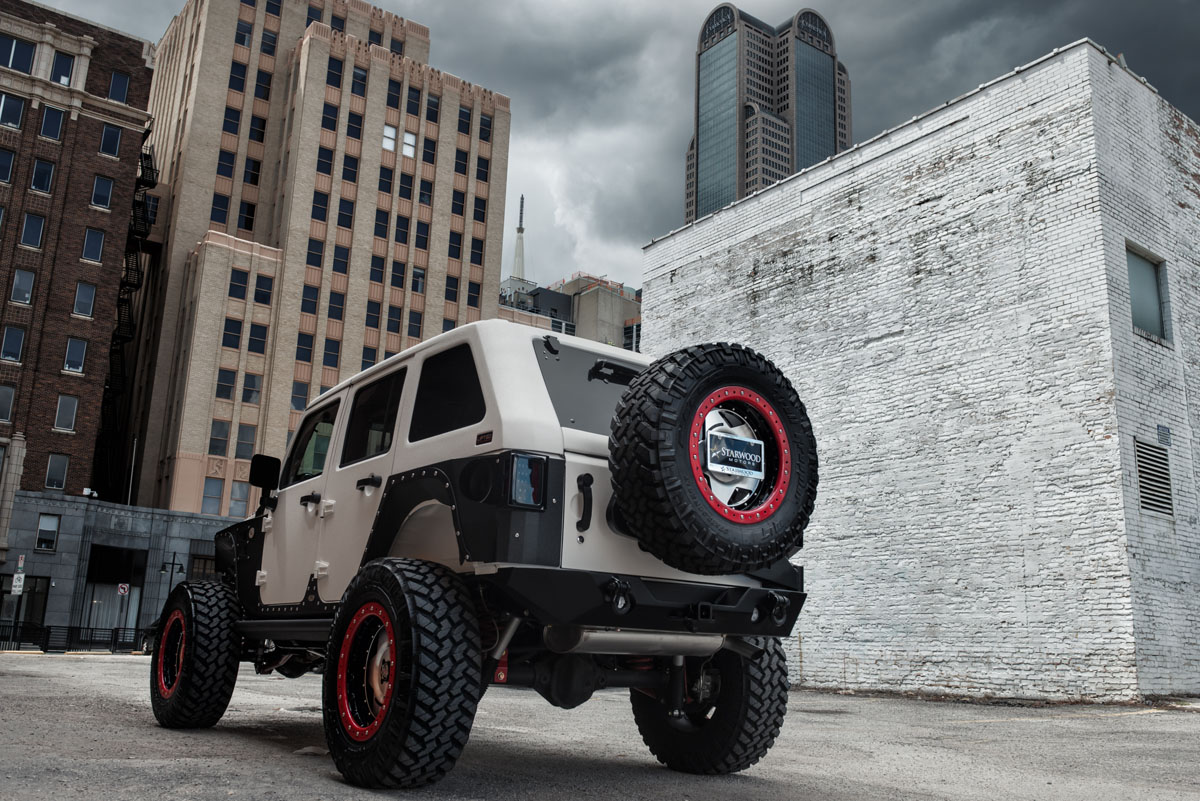 Moving towards the rear, the Starwood Motors Jeep Wrangler dominates with its XRC body cladding, black door handles, and AMP Power Steps. The rear of the Wrangler boasts a new Poison Spyder Rock Brawler II bumper with Tire Carrier and Recon Taillights to continue the custom-tailored rugged theme.