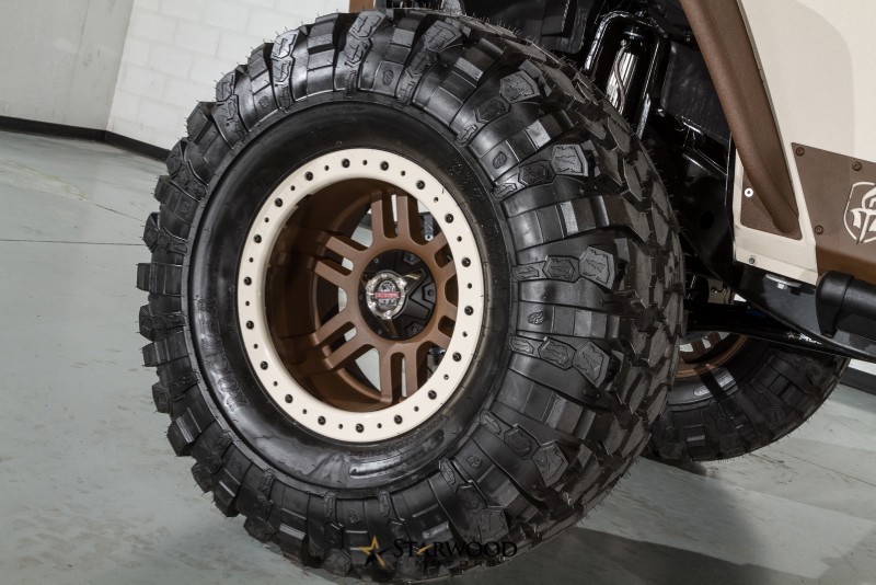 To really set off the look of the Starwood Motors 2015 Jeep Wrangler SEMA is a set of monstrous Center Line wheels with earth-grabbing tires. The new Center Line LT1 wheels measure a mighty 12.0 x 22 -44 at the front and rear and feature a simulated beadlock ring, wrapped in 44-inch Put Bull Rocker tires for never-ending grip. Each simulated beadlock ring wears a body-colored Antique White finish while the wheel centers contrast with a powder coated Cardinal Rust finish. New 5.13 gears turn the gigantic setup while powerful Baer brakes wearing a Glass Tan powder coat brings them to a halt.