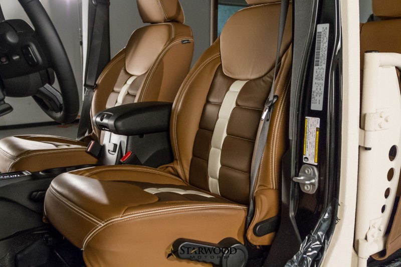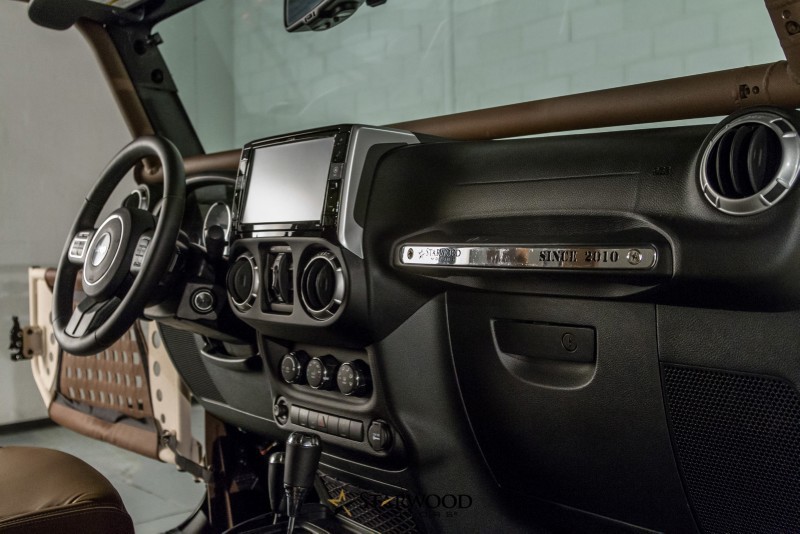 Although it’s all about experiencing the great outdoors, this custom Jeep from Starwood Motors does have a few luxuries that set it apart from your average rockkrawler Jeep. Drivers and passengers are treated to seats wearing Macho Amaretto Nappa leather with Mocha inserts and contrasting Gaia Striping down the center to match the earthy exterior tones. An integrated back-up camera and 9.0-inch Alpine Restyle head unit with Garmin navigation makes driving a bit easier, especially on tough trails in the wilderness.