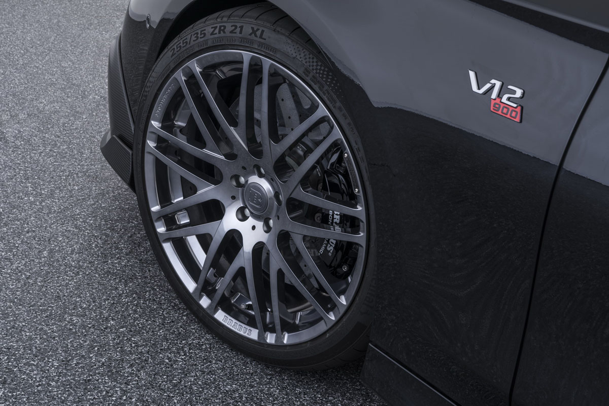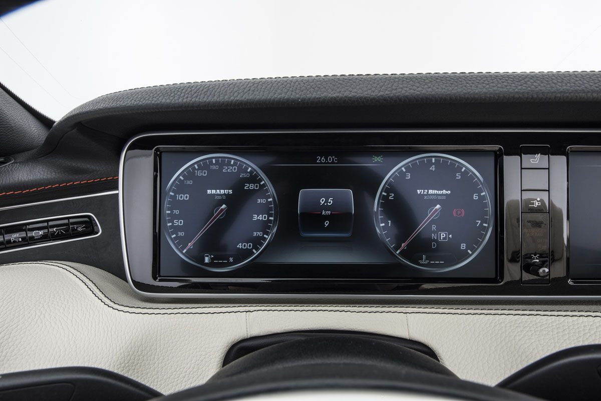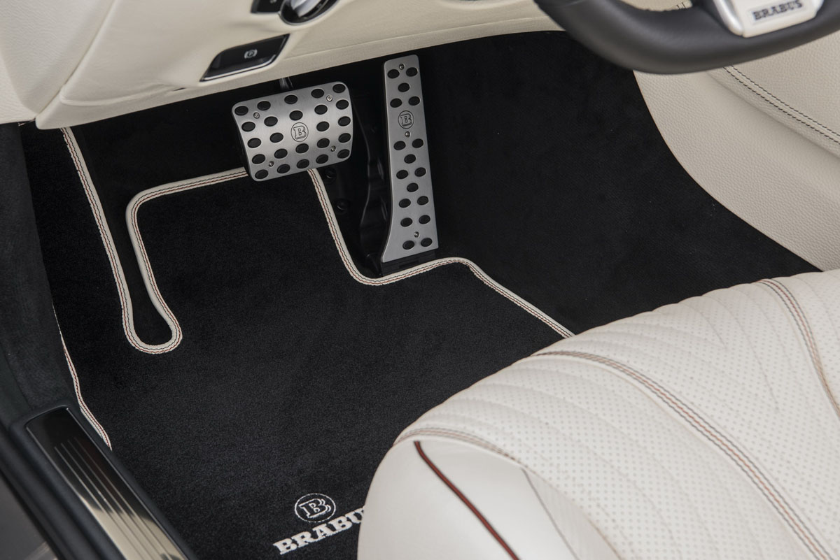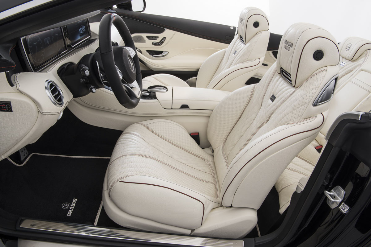 Brabus has also taken steps to make the interior of the world’s fastest and most powerful four-seat convertible an interior that’s worthy of showing off. New scuff plates illuminate the Brabus logo and can be color-matched to the interior ambient lighting. Aluminum Brabus Race paddle shifters, pedals, and door pins are also used along with a 400 km/h (250 mph) speedometer. The Brabus upholstery shop can also create a truly custom-tailored interior. The featured IAA show car sports a two-tone ‘Mondial Vanilla’ and ‘Mondial Black’ leather interior with decorative stitching and Black and Red topstitching. Brabus carpenters have also replaced the factory wood trim with custom Black Ash wood throughout the interior.
