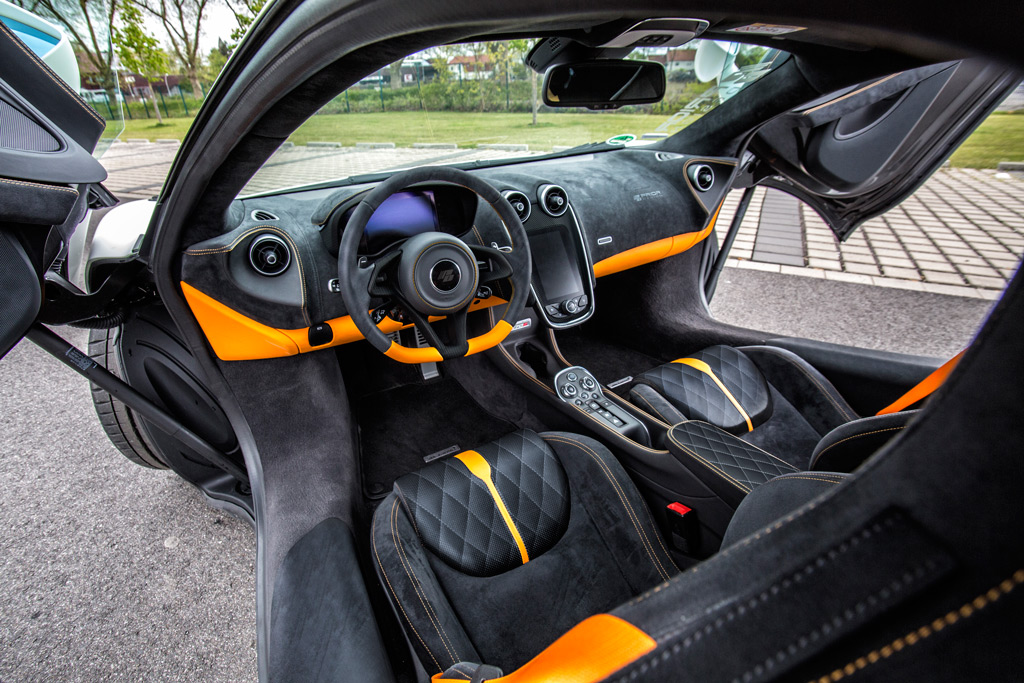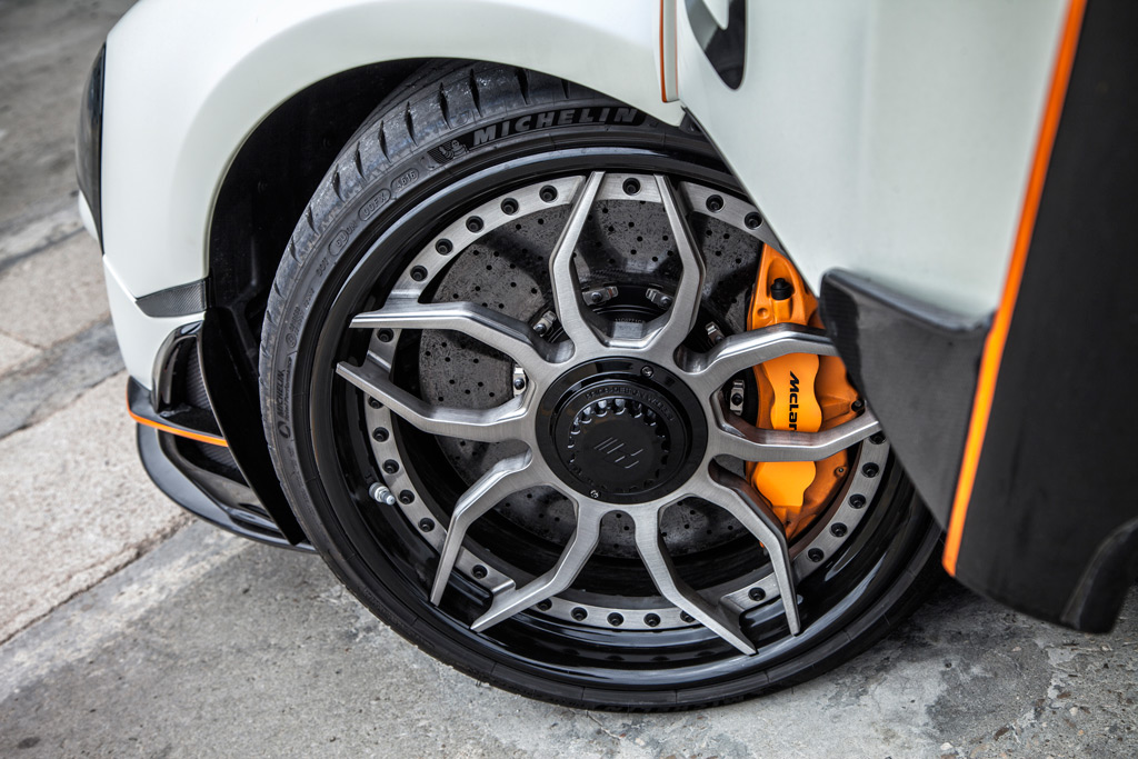 Complementing the new Prior Design McLaren 570S PD1 aero kit show car is a fresh set of PD3 three-piece alloy wheels. These center-locking, double-spoke wheels were fitted in a staggered 20 x 9.0 front and 11.5 x 21 rear setup, and are shod in 245/30 R20 and 305/25 R21 performance tires. Helping it all sit flush beneath the wheel wells is a new set of H&R sport springs that reduce the overall ride height and improve handling even more.