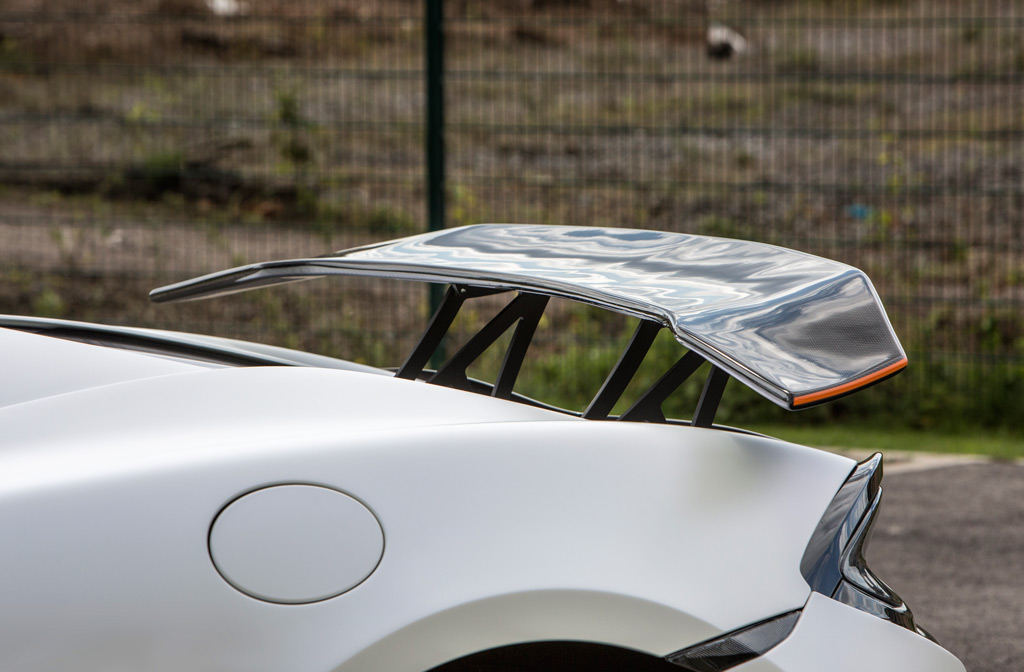 The rear of the Prior Design McLaren 570S PD1 aero kit is more dramatic and powerful thanks to a deep diffuser and six long fins to help channel airflow. A large, adjustable wing spoiler helps generate a great deal of downforce for better handling, cornering, and braking on the track. To finish it all off, a roof-mounted air scoop proudly sits on top.