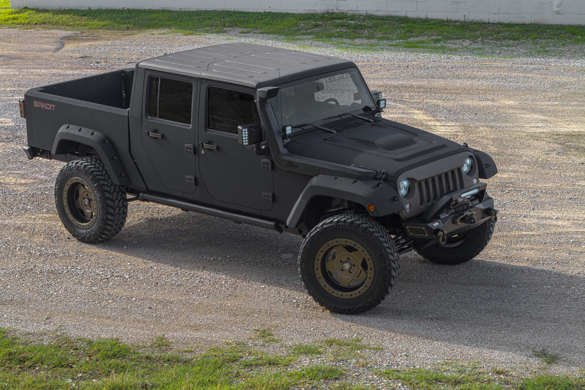 Sitting between those beefy Bushwhacker fender flares are AMP Power Steps that automatically retract for easier access. A Drake Off Road Fuel Door adds to the villainous character of the Starwood Motors Jeep Bandit Sport.