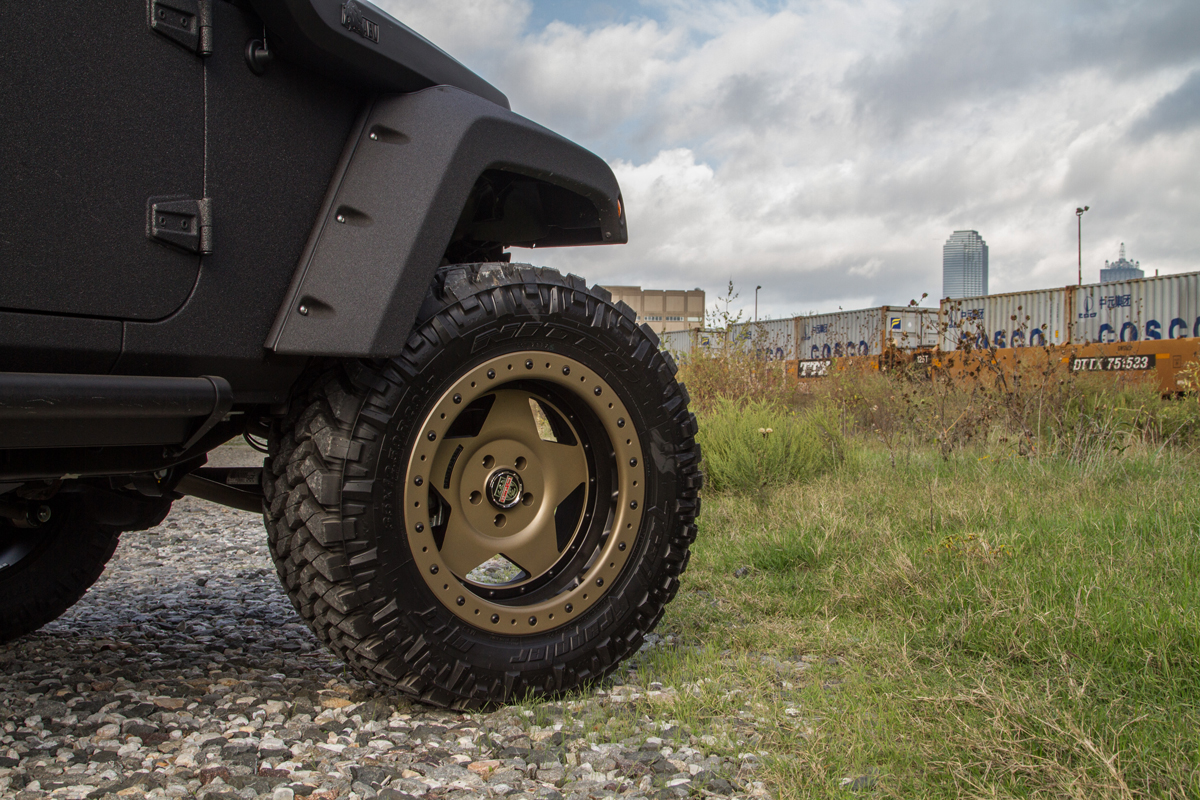 Part of what makes the Starwood Motors Jeep Bandit Sport so much fun is what lies beneath the body. The entire vehicle sits higher thanks to a powdercoated Satin Bronze Rubicon Express suspension. Hitting the ground are new Centerline RT1 wheels with a five-spoke, star-shape design in a large 10.0 x 20 setup at the front and rear. The new Centerline RT1 wheels are finished in a powdercoated Satin Bronze face with Gloss Black barrels and Black trim ring to instantly grab attention. Hardcore 335×12.5×20 Nitto Trail Grappler M/T tires ensure that grip is never lost, no matter the terrain.
