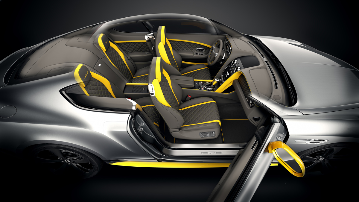Inside, the same eye-catching contrasts make their presence felt. The center and roof consoles as well as the main fascia are all dressed in carbon fiber for that sportier feel. A special Black Edition color split can be seen on the seats and center console where contrasting leather in Porpoise, Beluga, Pillar Box Red, or Cyber Yellow is used. Each door panel and the optional Mulliner GT Design seats can be given a diamond-quilted design with contrasting stitching.