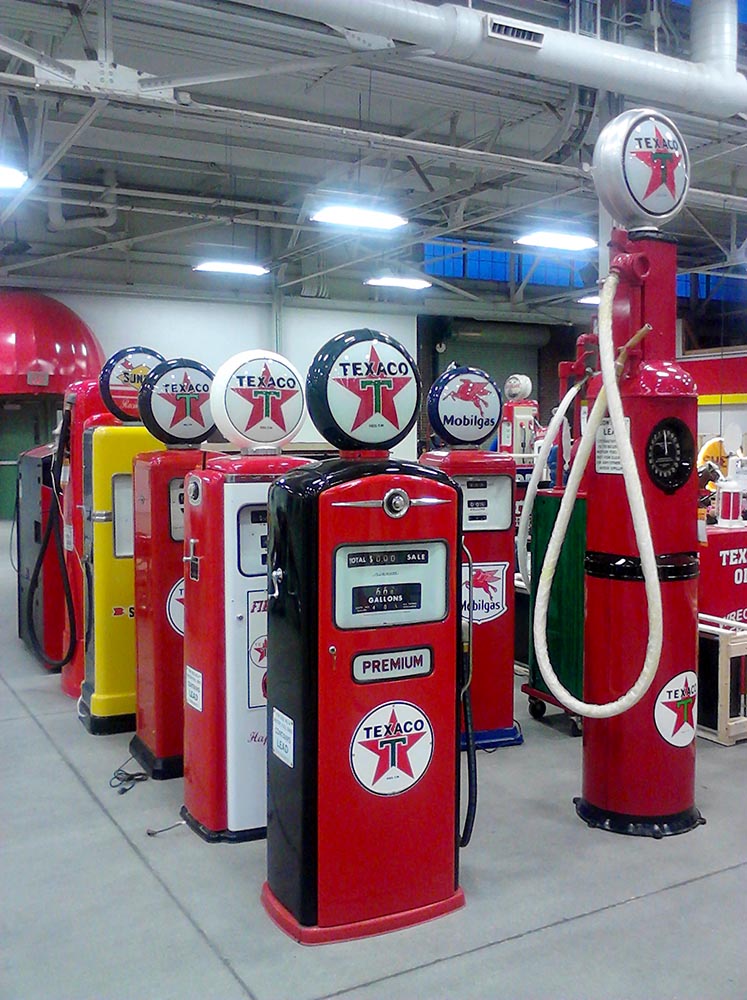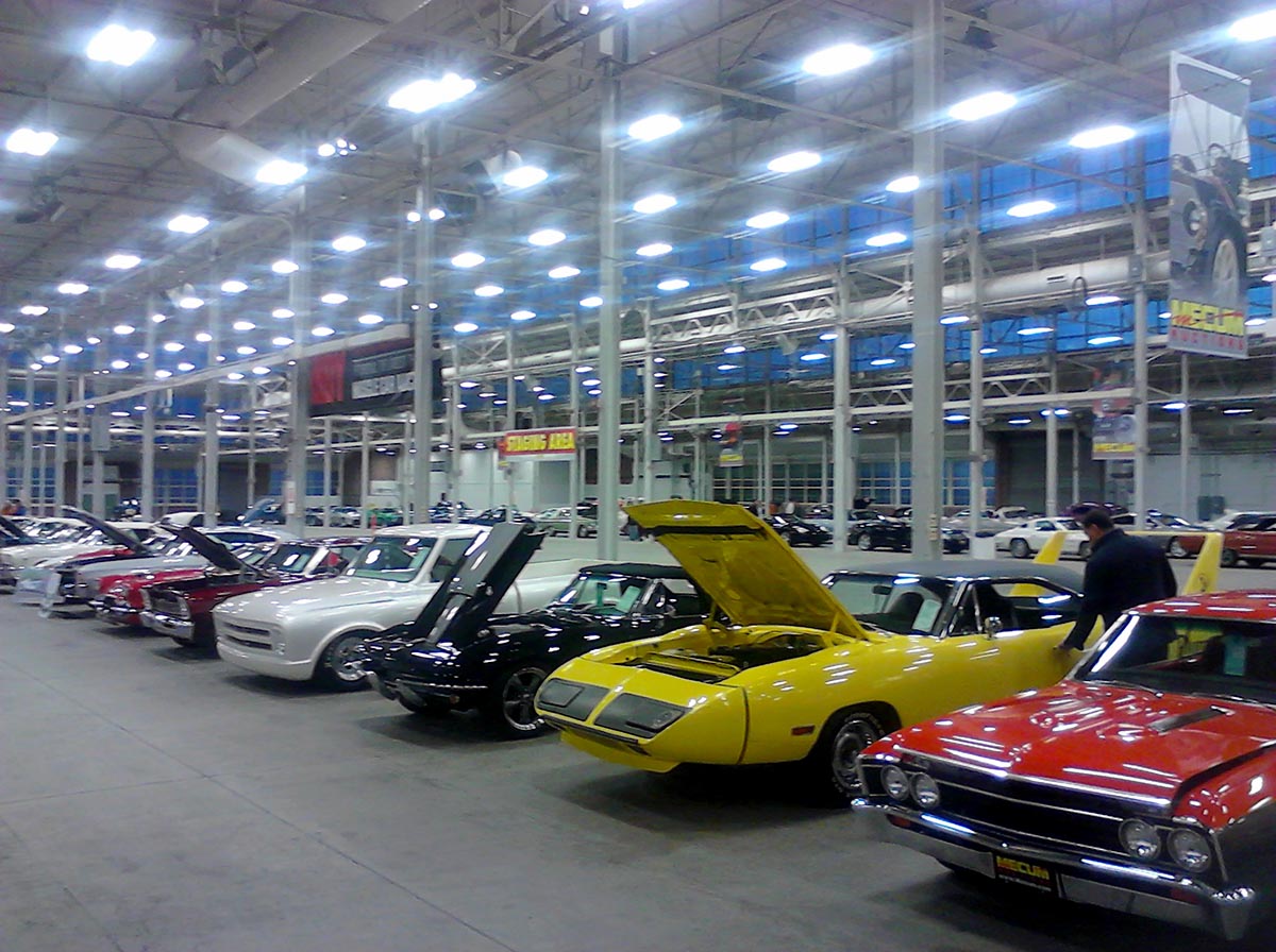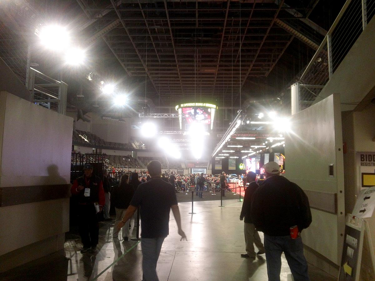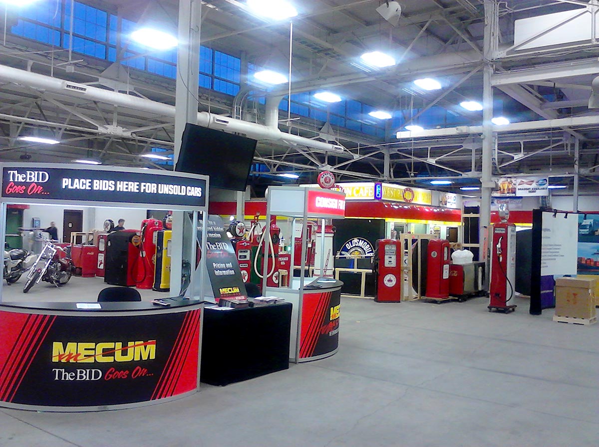 As you would suspect the Ford vs. Chevy debate ensued as my friend, Danya refused to acknowledge the exhaust burble of a ’59 Corvette, but demanded that we stand at attention when a 429 Mustang cleared its raspy throat. Good debate, good cars, good times. The lights dimmed shortly after the last car passed the block and we took one final trip around to see the cars. One notices that Mecum is a sales spot for more than cars. EVERYTHING automotive is for sale here from vintage gas pumps to neon signs for the collector’s garage. On our way out, we walked across the block. As my friend Rick reminisced with an old buddy, I looked around the arena and could still sense excitement in the air. Petrol and passion seemed to be mixed with oxygen and the vacant reserved seats signified the fact that big money had been shelled out for precious metal. I wish I had the space to talk about every single car I saw, but alas, I don’t. I will encourage you to enjoy our photo gallery, check out the Mecum website to see which cars went for the most at the auction and to find out when the Auction is coming to a city near you. It is a trip well worth the price of admission and a perfect gift to any aficionado of the hobby. I am now a Mecum Man for life!