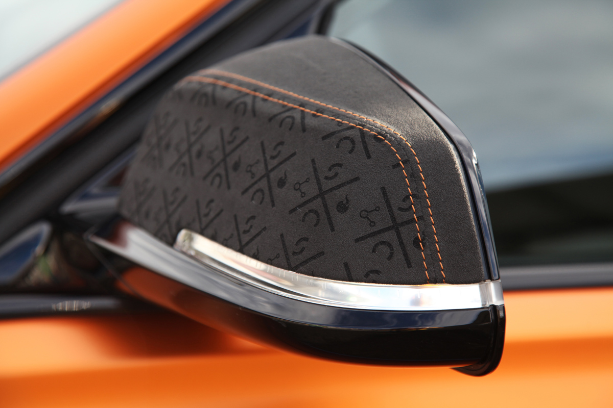 For that extra-special, custom-tailored touch, LederArt gave each of the exterior badges and both of the side mirrors laser-cut alcantara-leather fabric covers with special graphics and matching orange stitching to set it apart from the crowd even more.