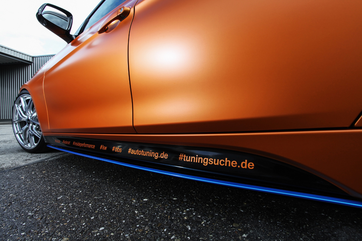 The Tuningsuche BMW 328i Touring was also given a dramatic visual enhancement thanks to Putscher Car Wrapping. The entire body was covered in a special Satin Canyon Copper vinyl wrap with blue highlights on the side skirts, front lip, and newly-installed rear diffuser.