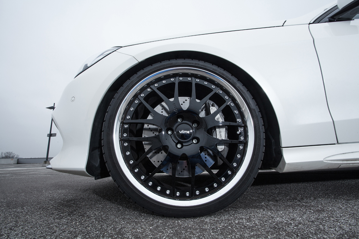 The factory front brakes on the Mercedes-Benz E500 were swapped out for a new set of 390 mm discs and six-piston calipers. New high-performance pads, stainless steel flex lines, and Castrol SRF racing fluid ensure maximum stopping power at all times. Hiding the fatter brakes are three-piece VAETH forged wheels in a 9.0 x 20 front, 10.5 x 20 rear fitment with 255/30 R20 and 295/25 R20 tires. The new wheels can also be fitted in sizes ranging from 8.5 to 11.0 x 20 with custom-finished center stars.