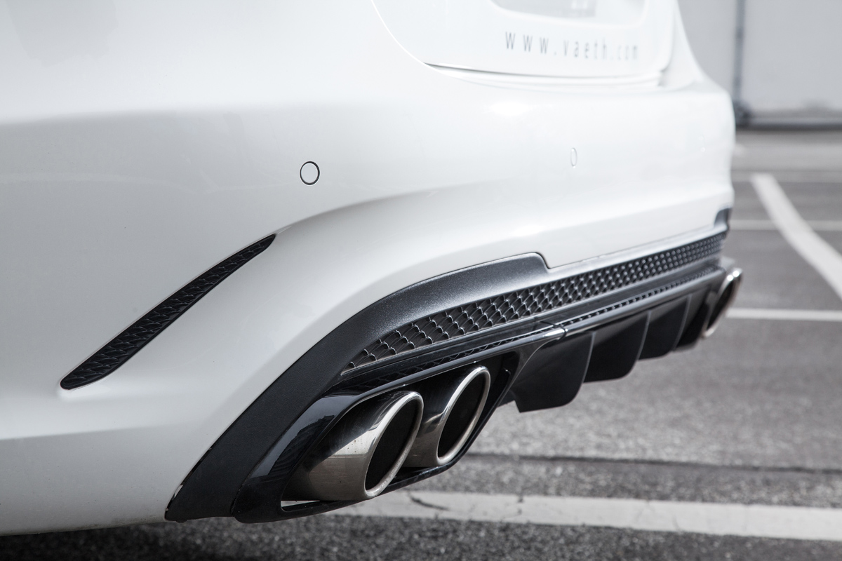 The starting point is the M 278 twin-turbocharged 4.6-liter V-8 engine that is packed with potential thanks to those two snails feeding boost. VAETH developed their V50RS tuning kit specifically for this engine that includes a new intercooler and ECU software tune catered to each individual engine. The kit also features a stainless steel axle-back exhaust system with valve controls ending in two 115 x 85 mm tailpipes with crimped edges. That’s good for a boost up to 550 horsepower and 612 lb-ft. of torque along with a top speed of 186 mph with the proper tires.