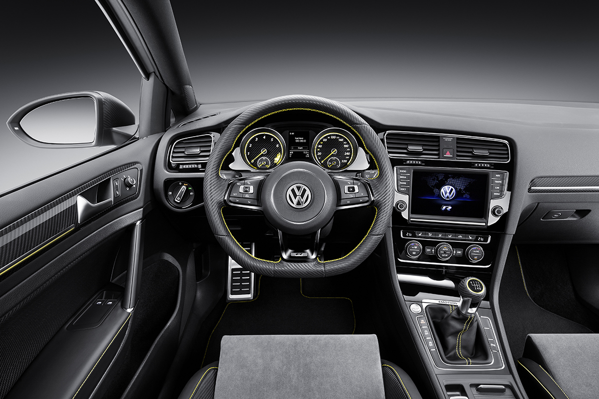 Inside, the theme is motorsport. The shell seats with integrated head restraints and belt openings wear Alcantara cross-quilted middle panels and outer carbon leather shells with ‘Lemon Yellow’ stitching to match the exterior and ‘R’ badges embroidered on the backrests. Each of the rear individual seats in the Golf R 400 wear the same design, while the middle is adorned in black nappa leather. A glossy piano black finish graces the center console, dashboard and around the air outlets, while carbon leather covers the sport steering wheel with decorative stitching. Carbon leather door panels and stainless steel side sills greet passengers and lend to a sportier atmosphere.