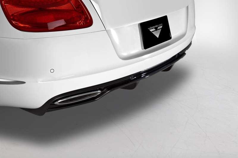 Along each side of the Vorsteiner BR-10 Bentley Continental GT sit a pair of two-piece side skirts. The skirts help calm the airflow around the wheels and feature a single body-colored piece and lower carbon fiber sill extension to match the design of the lowered front spoiler. At the rear of the Vorsteiner BR-10 are a deck lid spoiler and diffuser. The spoiler helps to create additional downforce at the rear axle at high speeds. The carbon fiber diffuser was designed to utilize aerodynamic fins while accommodating the stock brake light housing and exhaust tips.
