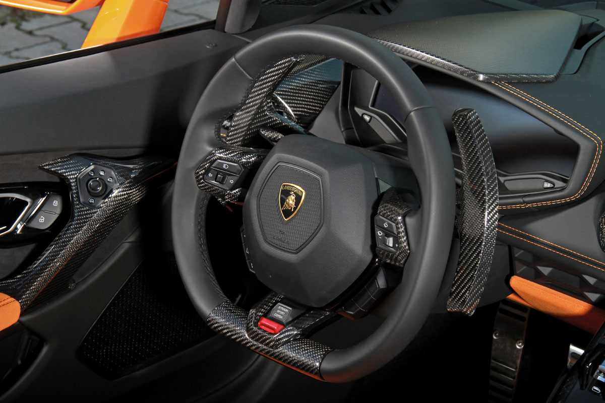Even the interior of the VOS Performance Huracan Spyder got the lightweight treatment. A full carbon fiber trim was installed, adorning the center console, door panels, air vent nozzles, door sills, steering wheel and paddle shifters, and dashboard. The instrument panel also wears the woven materials albeit with a matte finish to reduce glare from the sun.