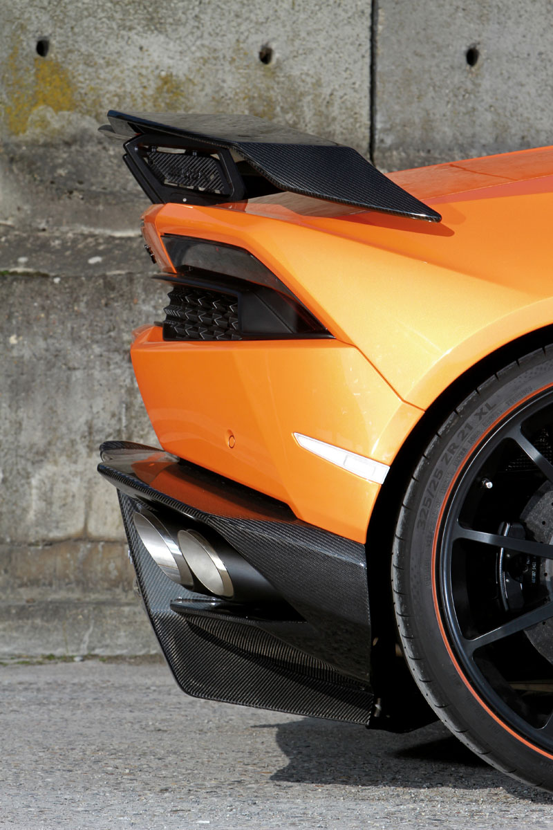 As part of the visual updates, the Huracan Spyder also gains a new set of wheels. Here, VOS Performance opted for a set of Mansory V10 alloy wheels finished in black with an orange strip around the outer barrel to match the body color. These 9.0 x 20 front and 12.5 x 21 rear wheels wear 245/30 ZR20 and 325/25 ZR21 Michelin or Pirelli high-performance tires. As an option, customers can also opt for 9.0 x 20 and 12.0 x 21 LOMA Wheels as well.
