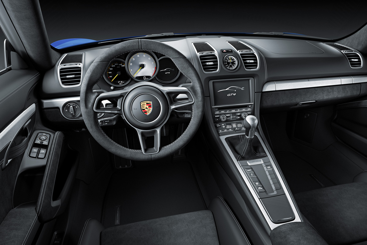 Driving dynamics were a focus throughout the development of the new Porsche Cayman GT4, especially with the optimal placement of its engine. Instead of the smaller, less powerful flat-six units found in the standard Caymans, the GT4 gets a 3.8-liter flat-six that’s derived from the 911 Carrera S and spits out 385 horsepower at 7,400 RPM and 310 lb-ft. of torque from 4,750 to 6,000 RPM. That’s 45 horsepower and 30 lb-ft. of torque more than the Cayman GTS.