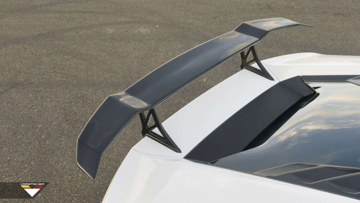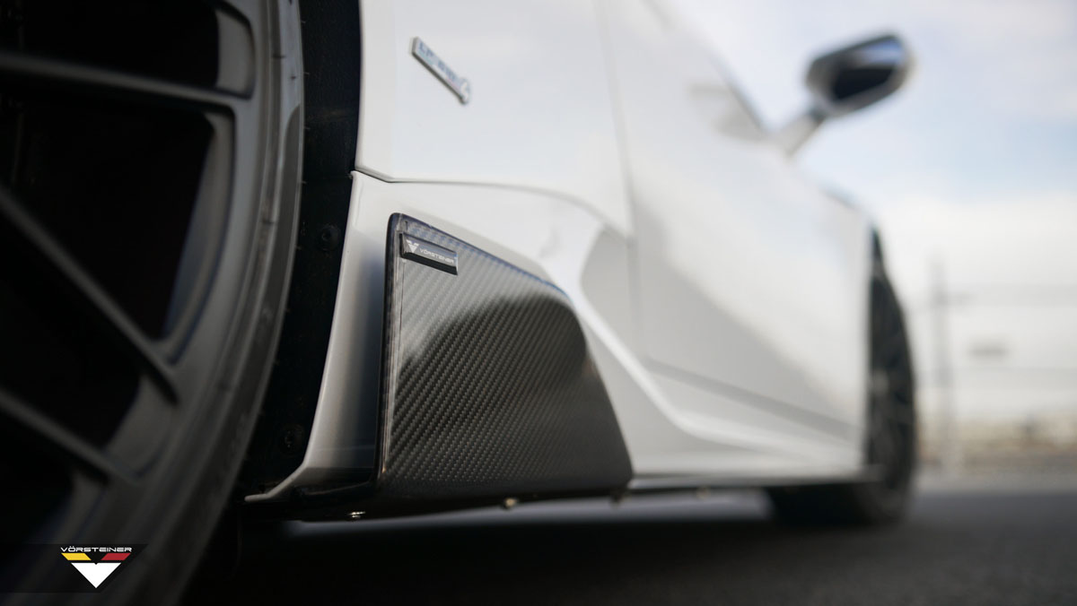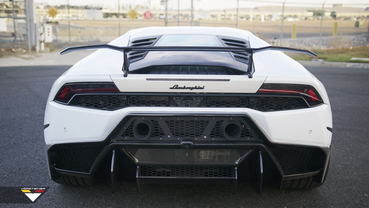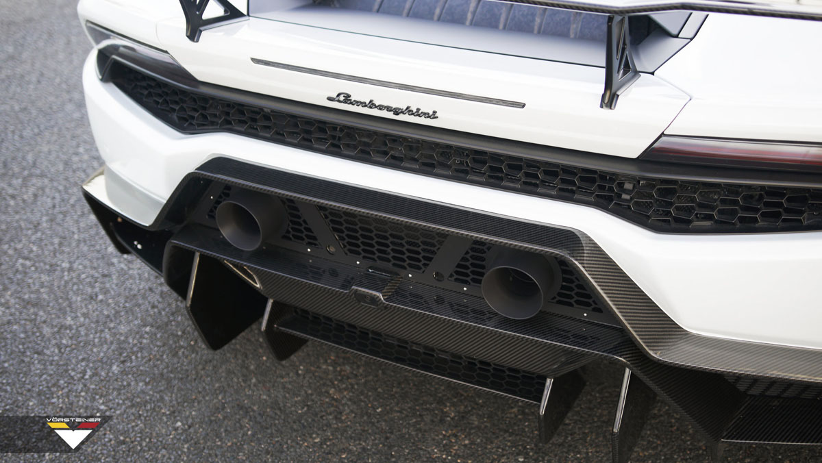 Sharp side skirts connect the front to the rear of the Vorsteiner Novara Huracan and continue the low, aerodynamic lines. The rear fascia benefits from a new bumper with massive carbon fiber fins to channel air exiting the underbody. Two large tailpipes sit above that make up the new Novara RS system, and emit a powerful V-10 roar. Sitting atop the deck lid is a prominent spoiler wing with the same sharp-angled design language as the body of the Huracan.