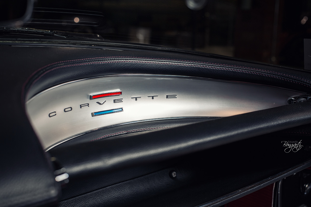 The fully-restored, original C1 Corvette body was completely repainted with a two-tone Peugeot Grey (Gris Aster) and GMC Red Effect covered with a four-layer clear lacquer. New rear fenders extend outwards by approximately 10 cm to show off its power and muscle, while a black fabric convertible hood provides some weather protection if needed. Staring ahead are two BMW E36 Angel Eyes headlights that fit perfectly inside the four round housings.